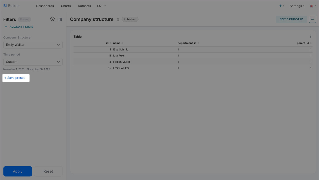 - Once saved, the preset will appear in the report's left panel. Select it to quickly apply the desired filters.