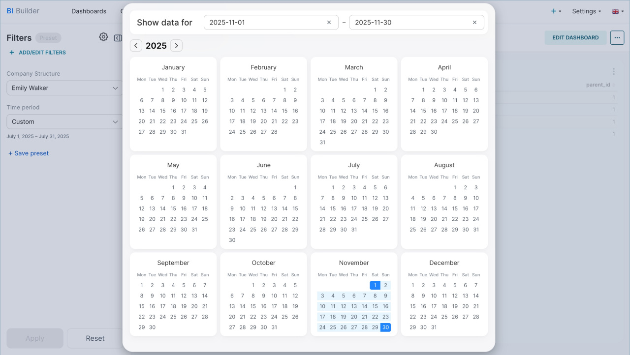 In the BI Builder, filters have been updated, presets added, and the logic for limits has been changed. These updates make it easier to switch between data slices and analyze reports: