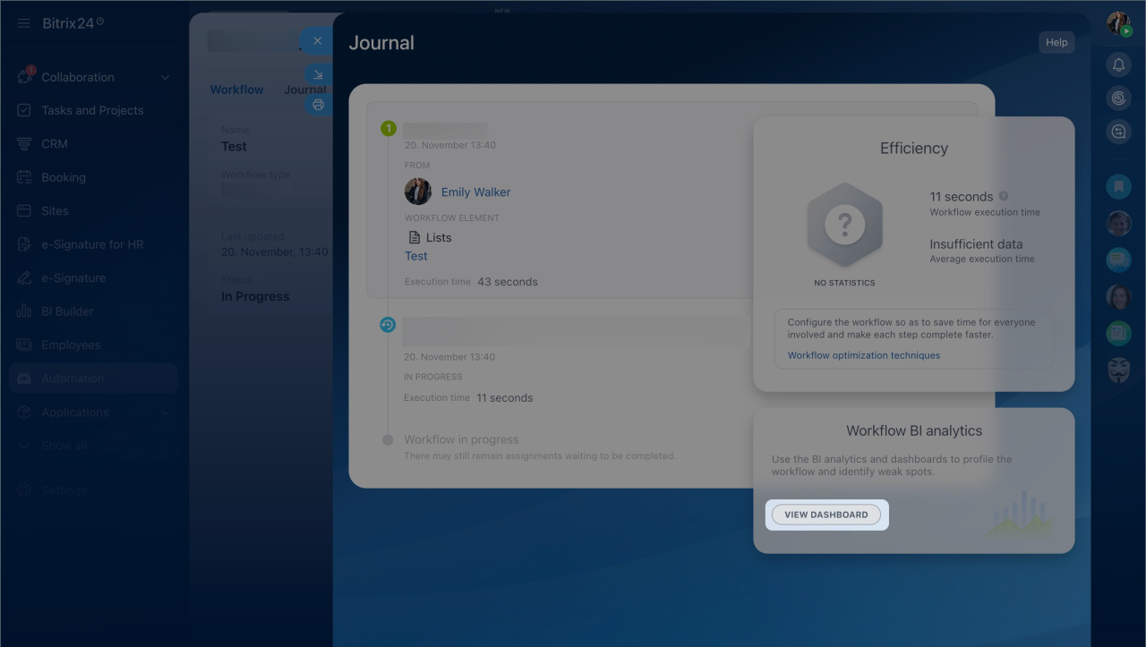 - Filters by parameters and company structure — it helps view data for specific employees, task flows, or workflow templates.