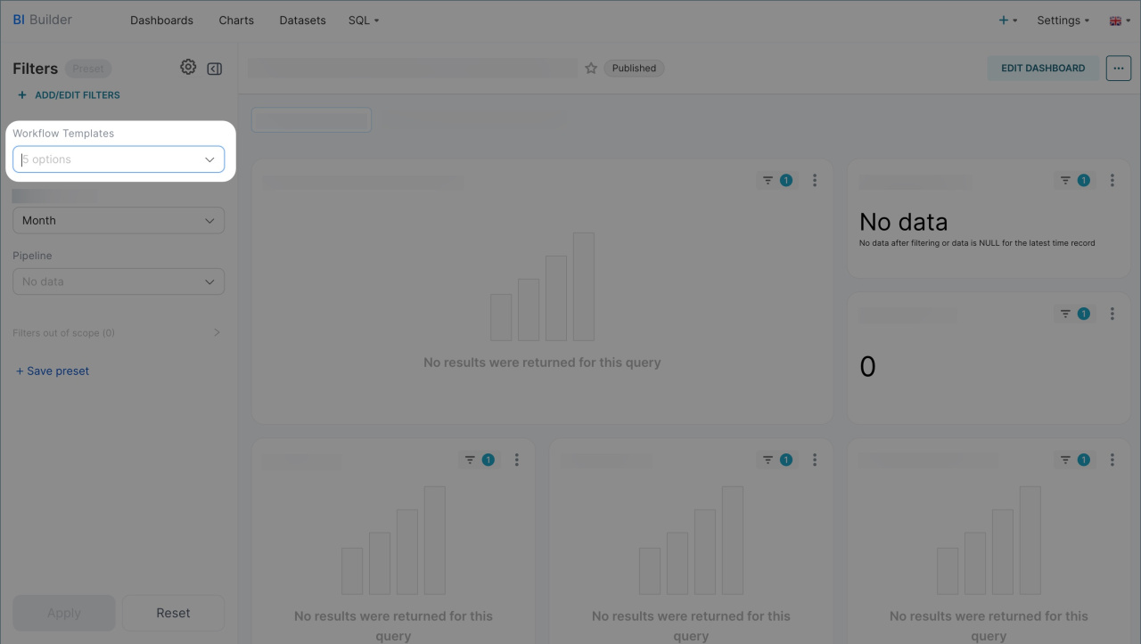 To use filters, add the corresponding parameters to the report settings and the SQL query that builds the charts. In built-in dashboards, these parameters appear automatically, and the filter works immediately. In custom reports, the query needs to be edited manually.