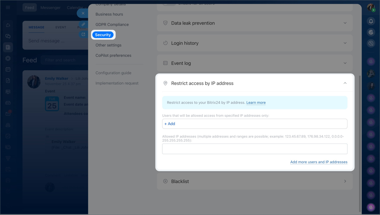 Administrators can set a list of trusted IP addresses and allow access to Bitrix24 only from those addresses. This helps protect corporate data from unknown devices and public Wi-Fi networks.
