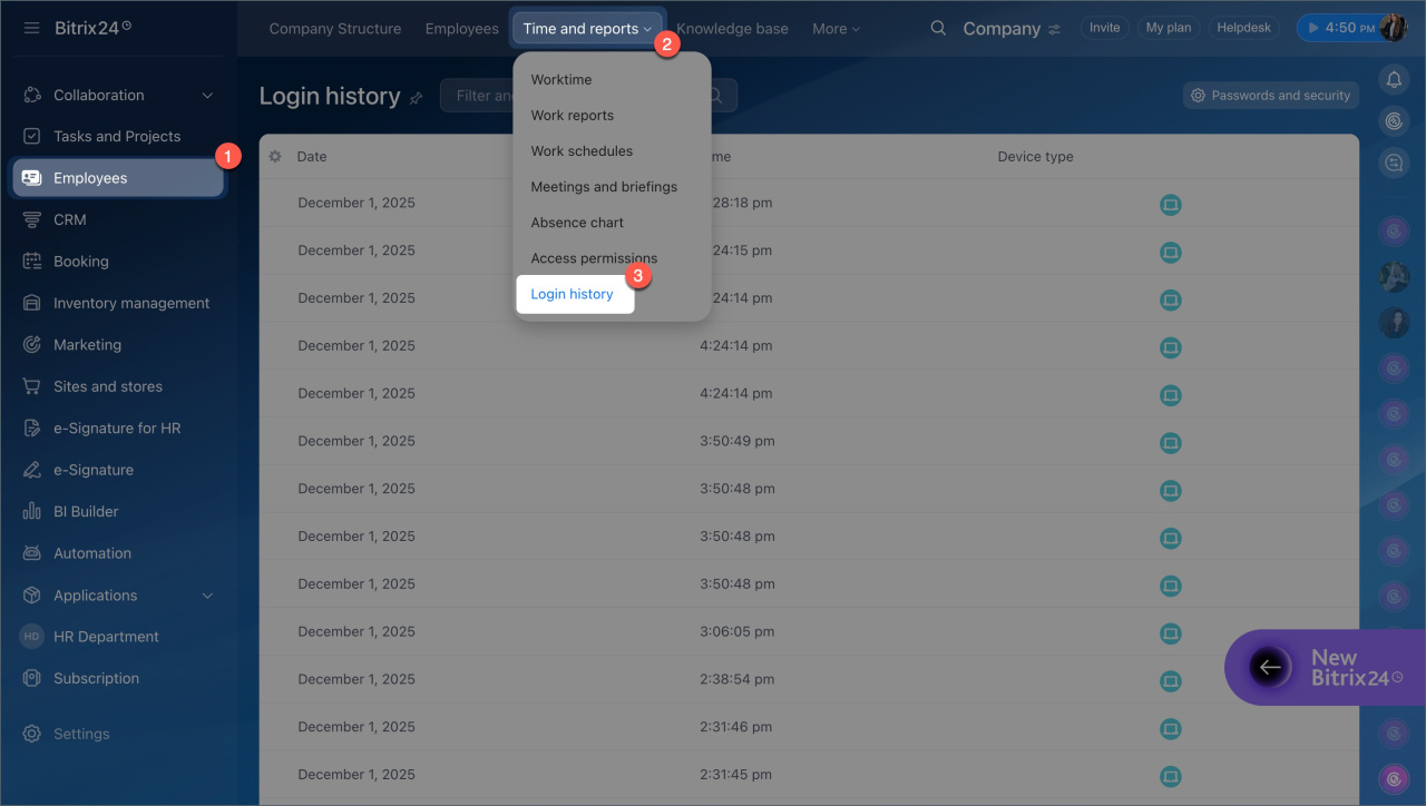 You can view the login history in the Employees > Time and Reports > Login History section. Administrators can see all employees' logins, while employees can only view their own.