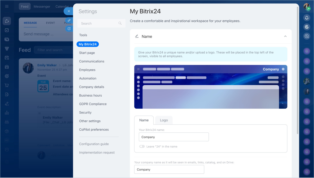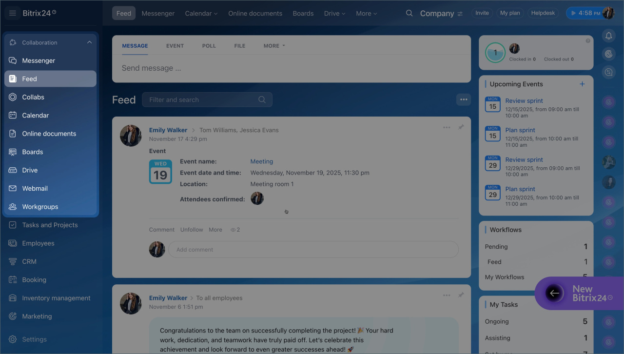 Bitrix24 is a multifunctional workspace for collaboration, where tasks, chats, calls, calendars, and other tools are interconnected. You don’t need to switch between different app. Everything you need for work is in one place.