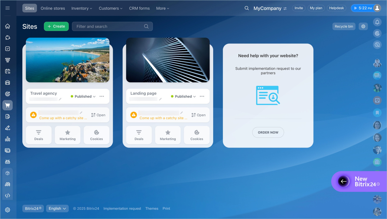 These articles answer frequently asked questions about creating sites and online stores in Bitrix24: how to change a domain, add SEO settings, connect payment systems, set up product discounts, and more.