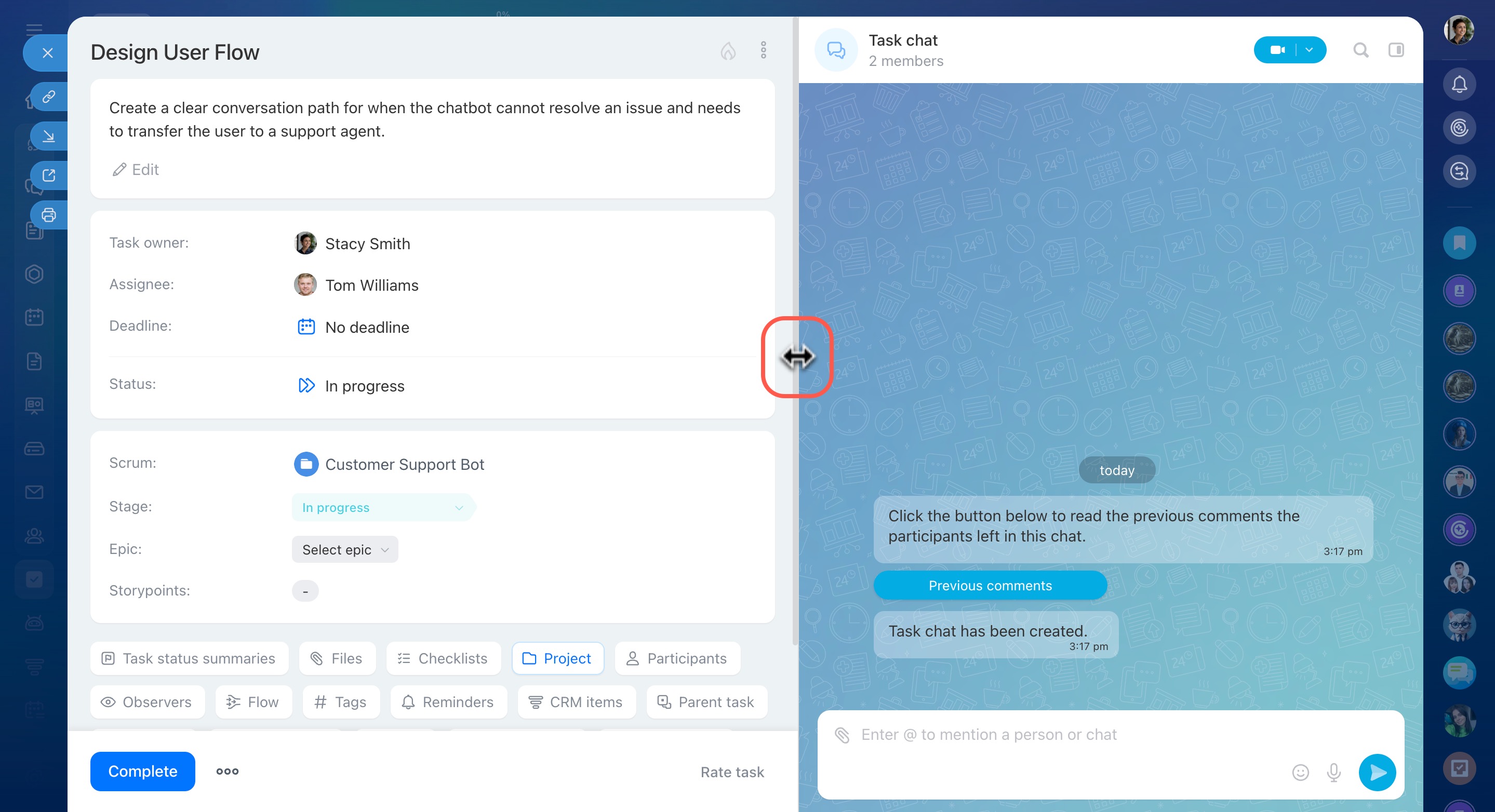 However, you can adjust the chat width. Just drag the divider between the panels. Your preferred width will be saved automatically for all tasks.