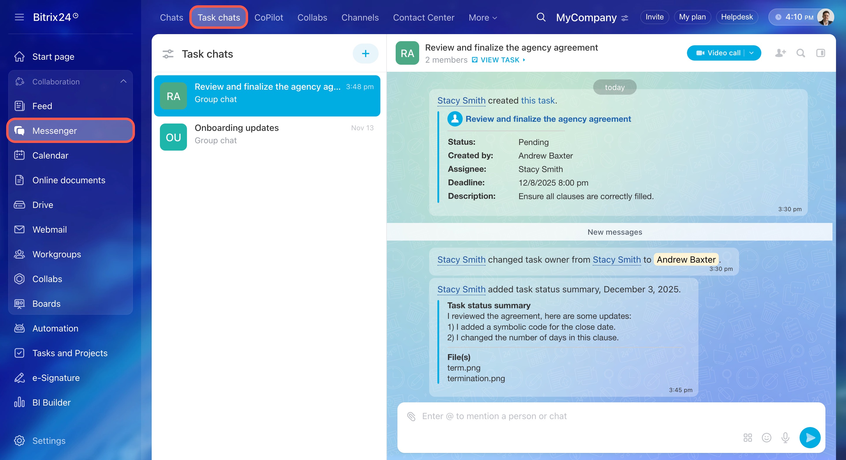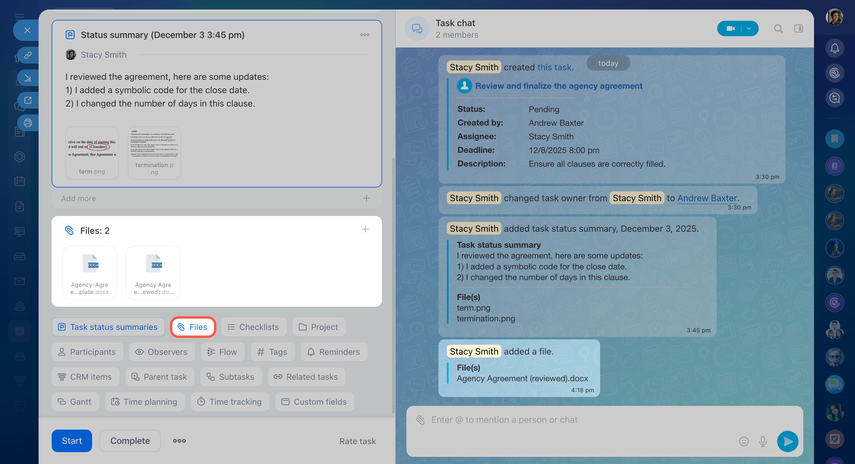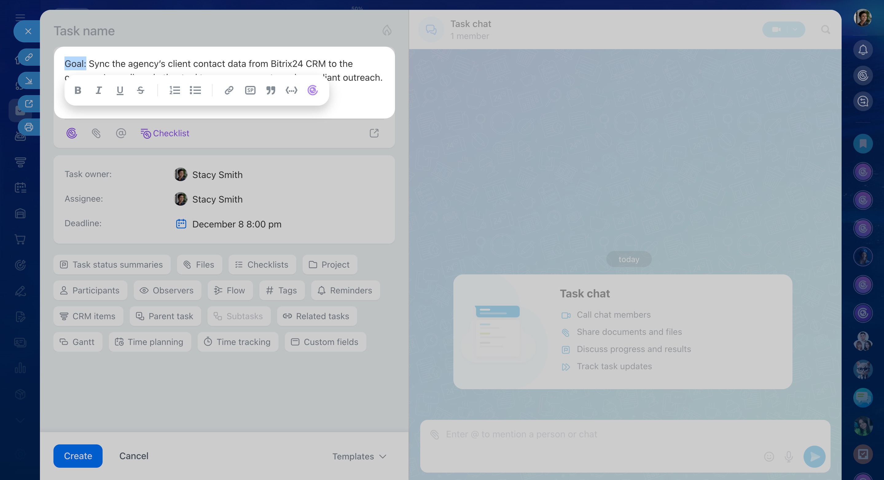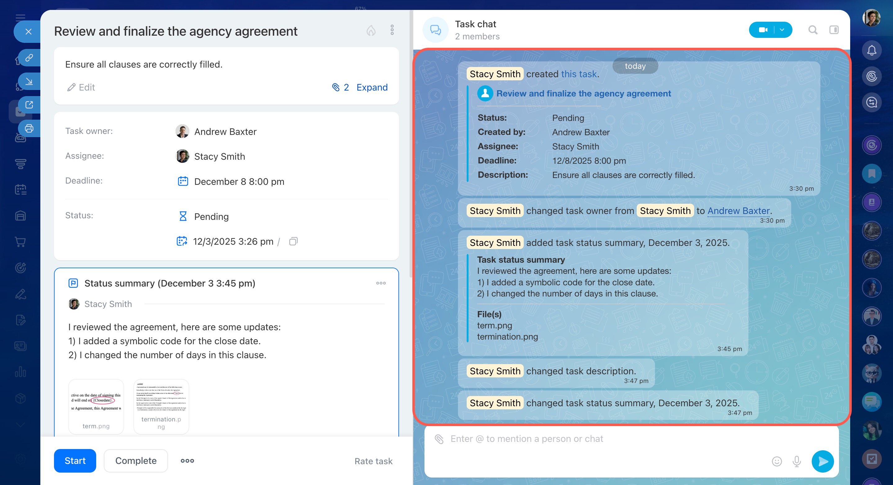 New tasks in Bitrix24 are more than just fields and comments. They are a single workspace where everything happens—discussion, action, and results. The task chat is now the central place for communication and process coordination. Your team can make calls, share files, and make decisions without losing context or switching between different tools.