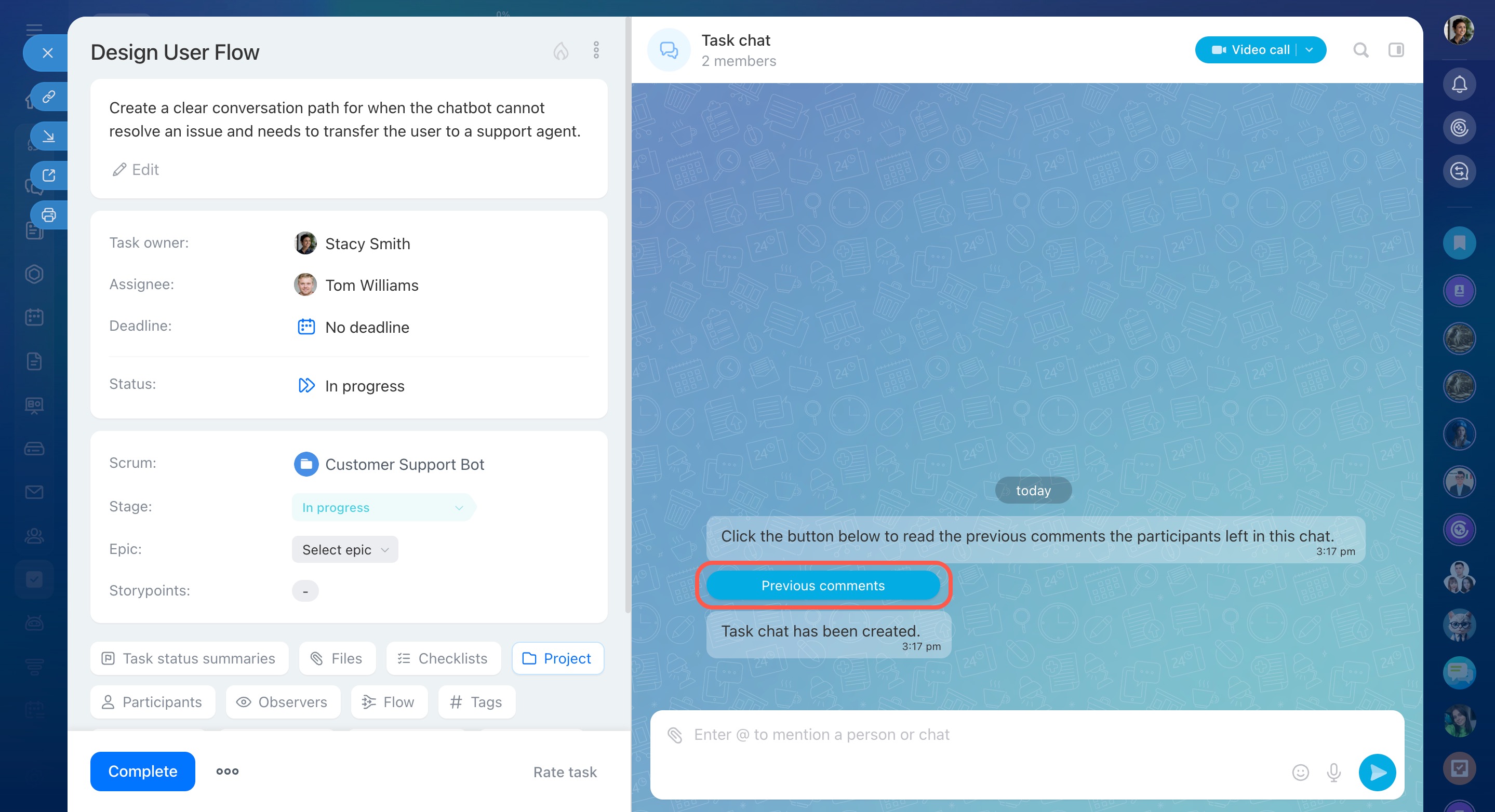 To view old comments, open the task and click Previous comments in the chat. These comments are read-only.