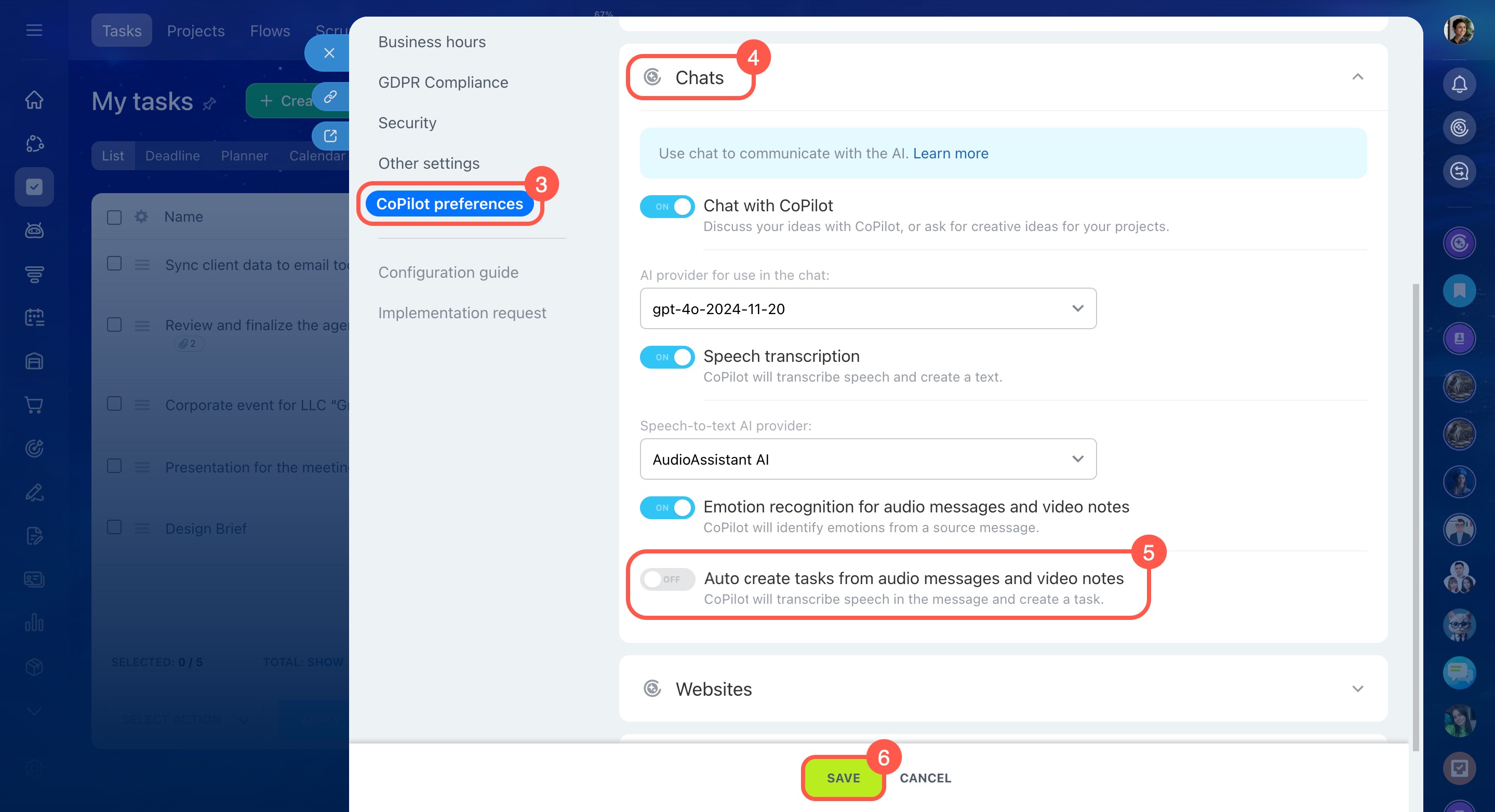 Account administrators can turn off automatic AI task creation from audio and video messages. Here's how: