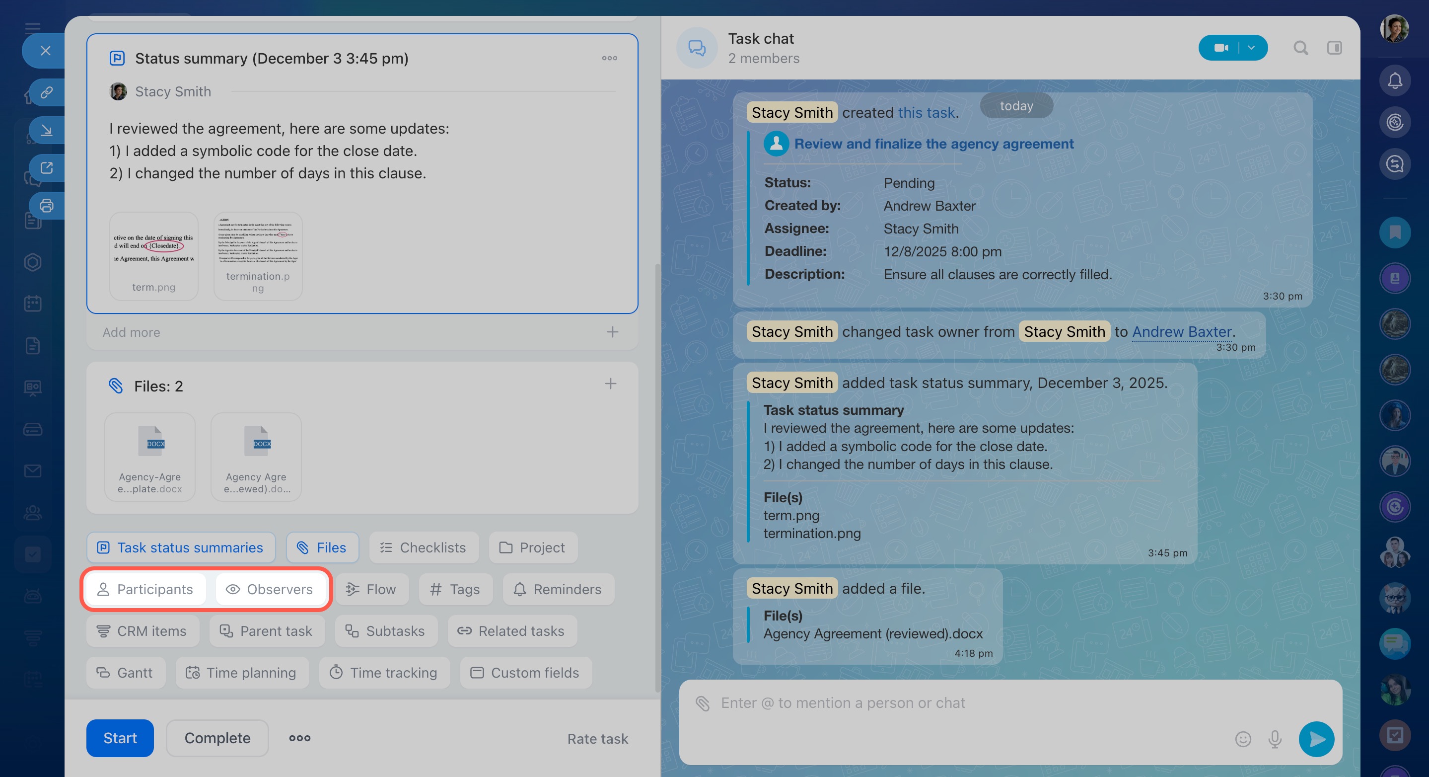 Mentioning someone in the chat does not automatically add them as a task participant. To include them, manually assign a role in the left section of the task form.