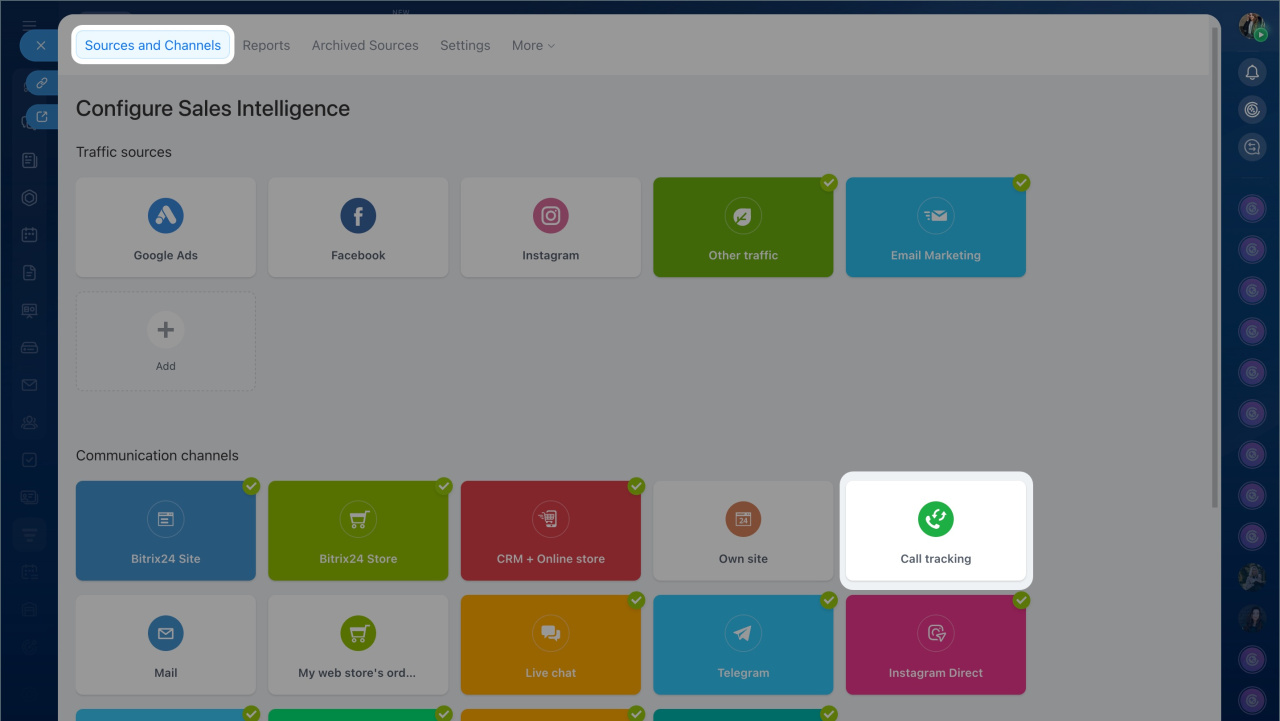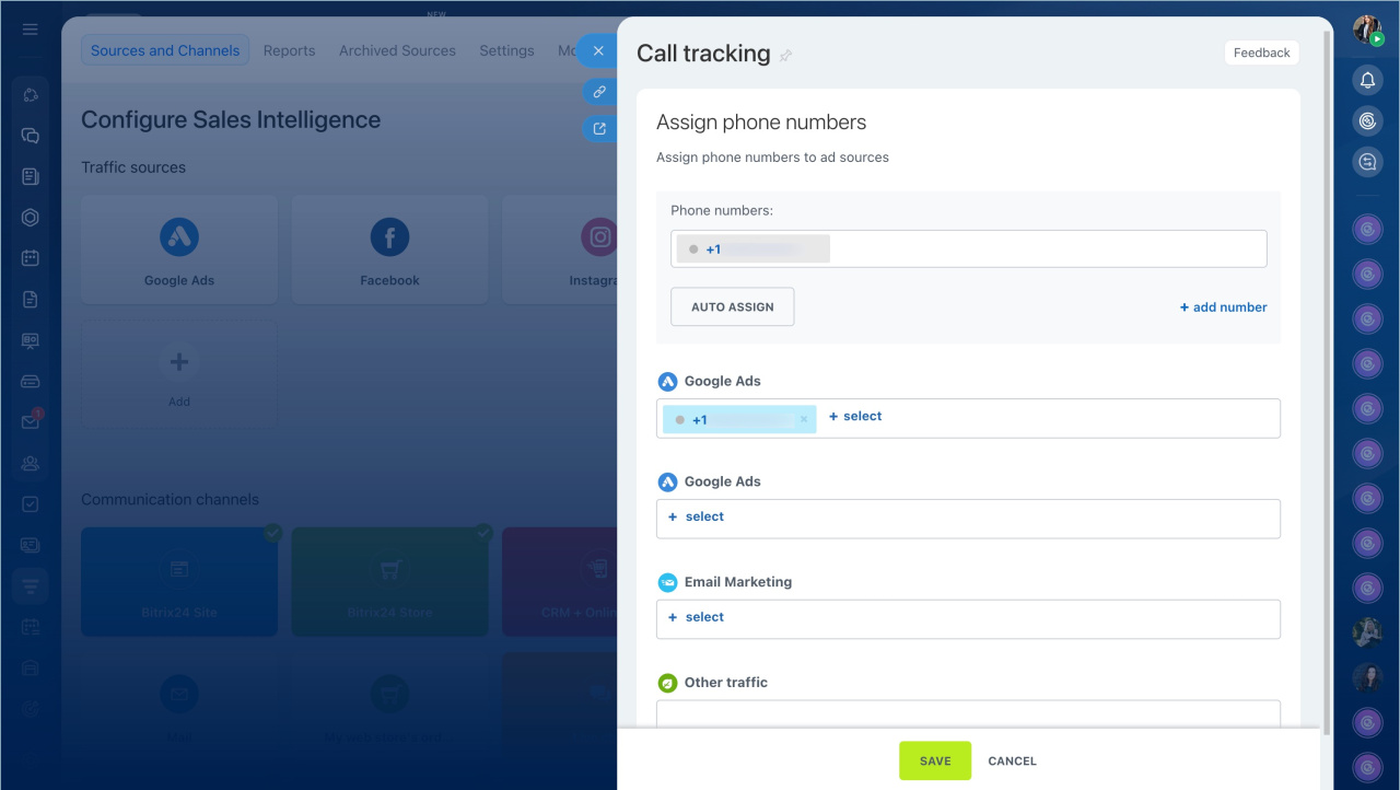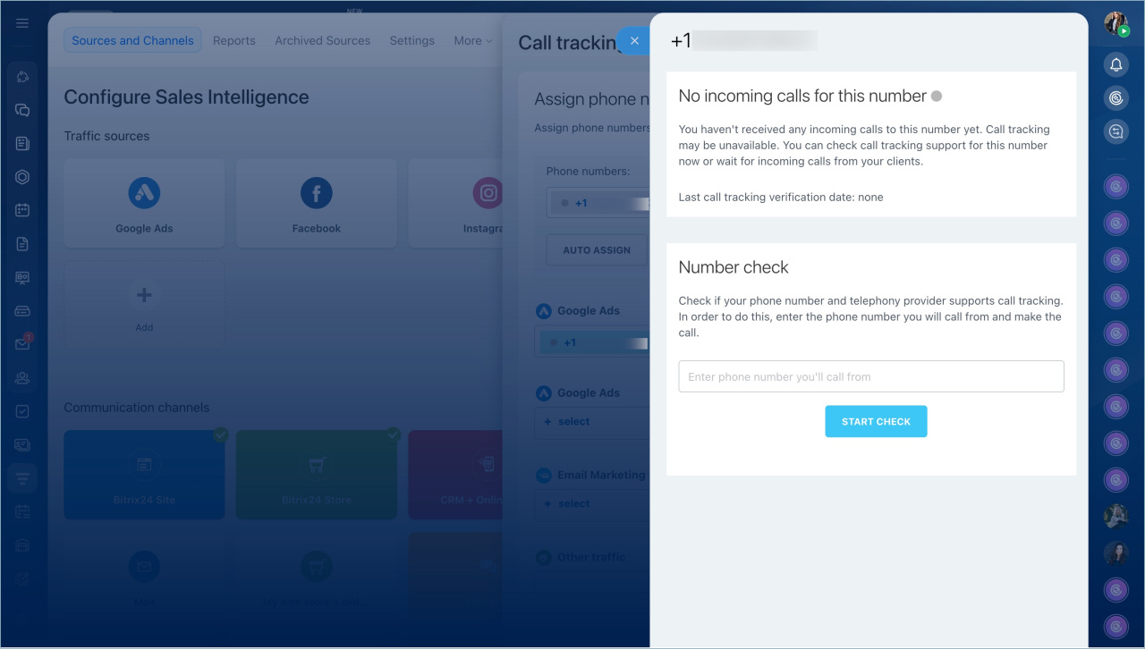 Not all operators and number types can identify the call source, so the number must be verified first. Bitrix24 includes a built-in verification tool to check if a number supports call tracking.
