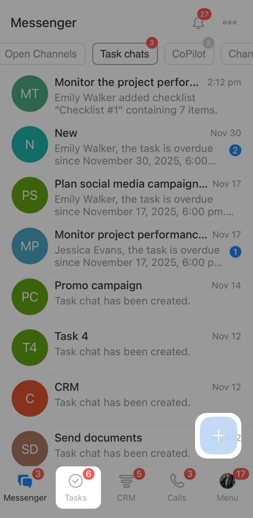 In the Bitrix24 mobile app, you can create a task in a few steps. It is convenient for quickly recording assignments without using a computer. Go to the Tasks tab. Tap + to create a new task.