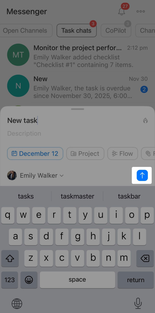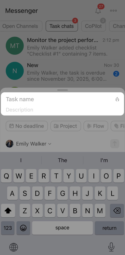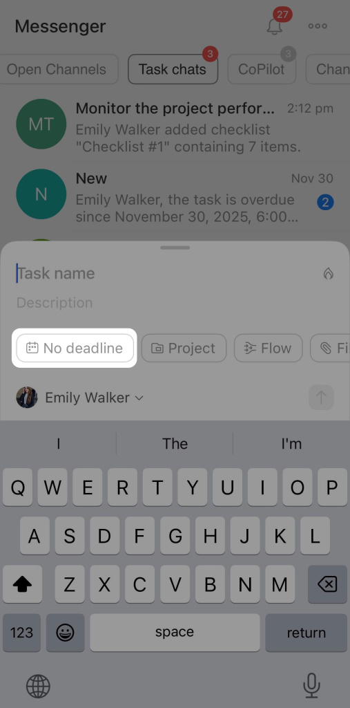 Enter the task title and a brief description to clarify what needs to be done. Select the assignee and set a deadline: today, tomorrow, the end of the week, or choose a date from the calendar.