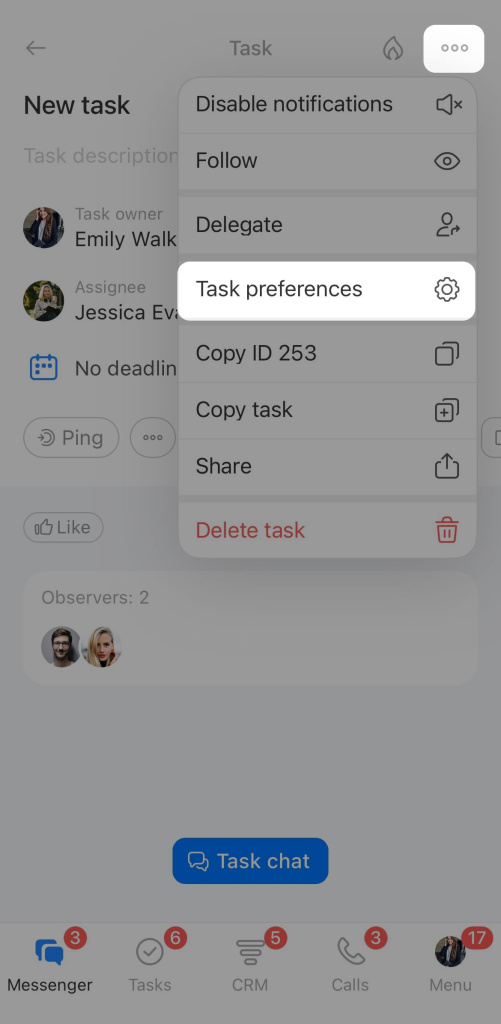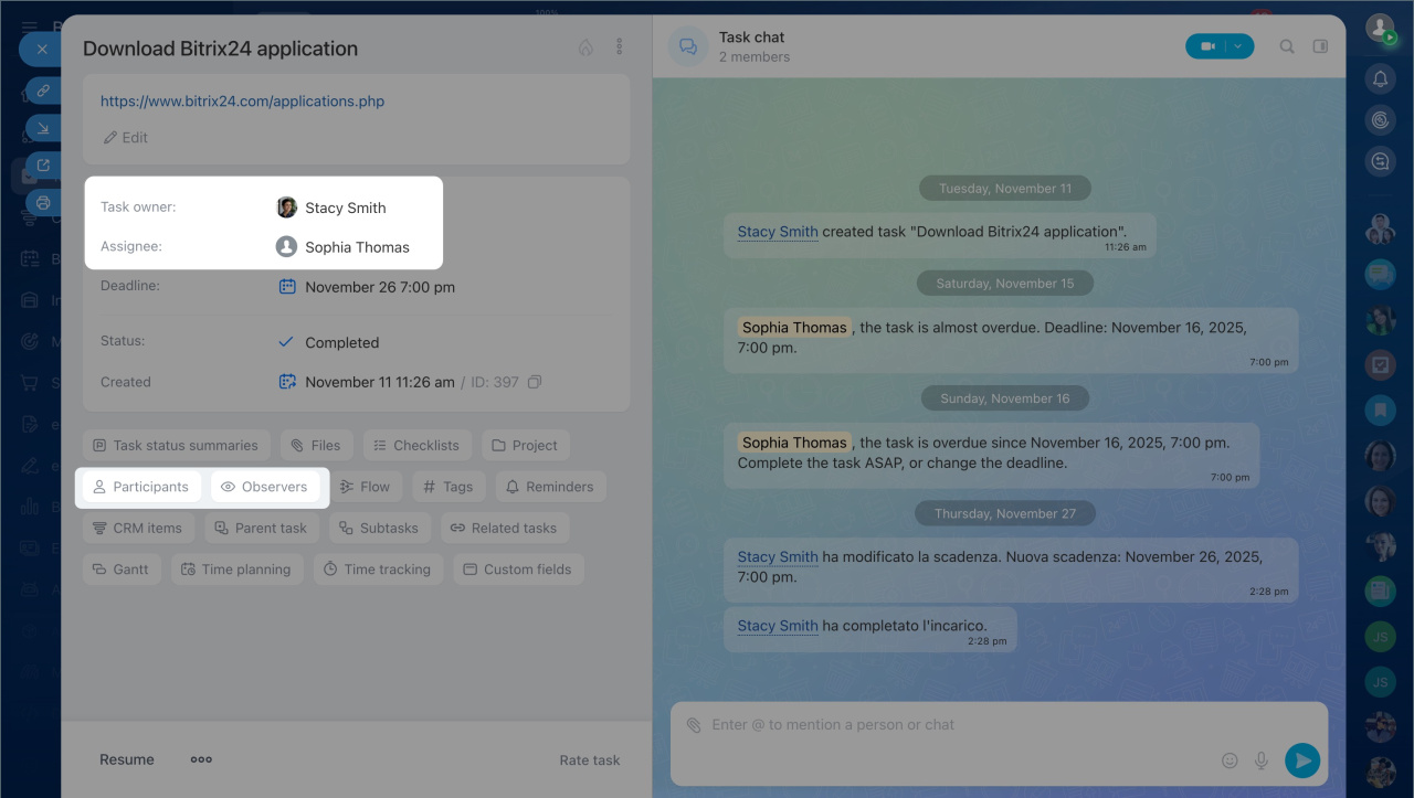 Working with tasks in projects - Participants and observers — add employees who assist with the task or need to monitor its progress. Participants perform part of the work, while observers see the entire progress.