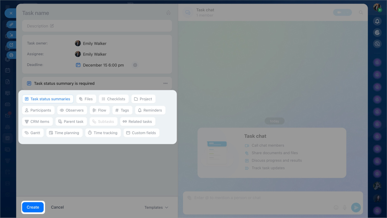 Use only the tools needed for a specific task. You can add others later. Once everything is set up, click Create. The task will appear in the list, and communication about it will continue in the chat.