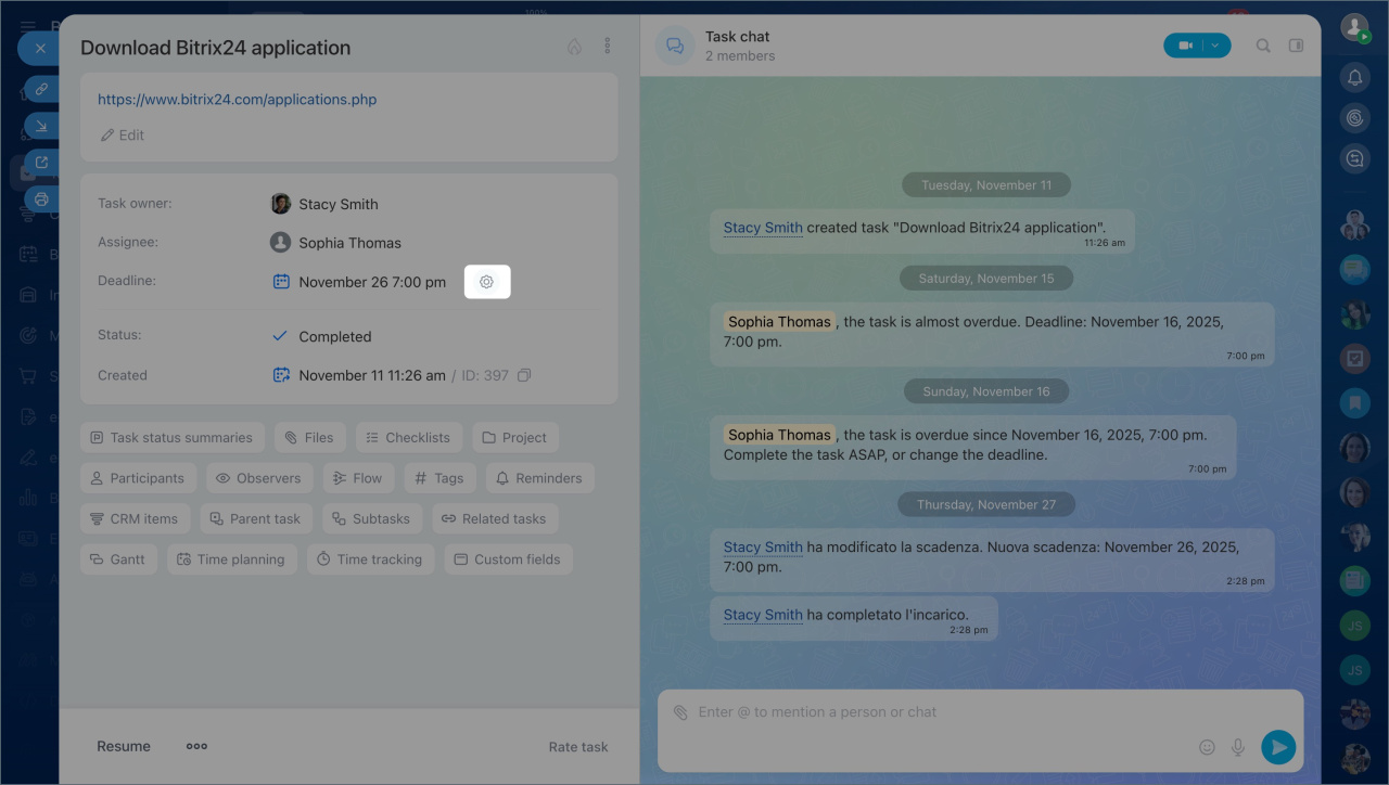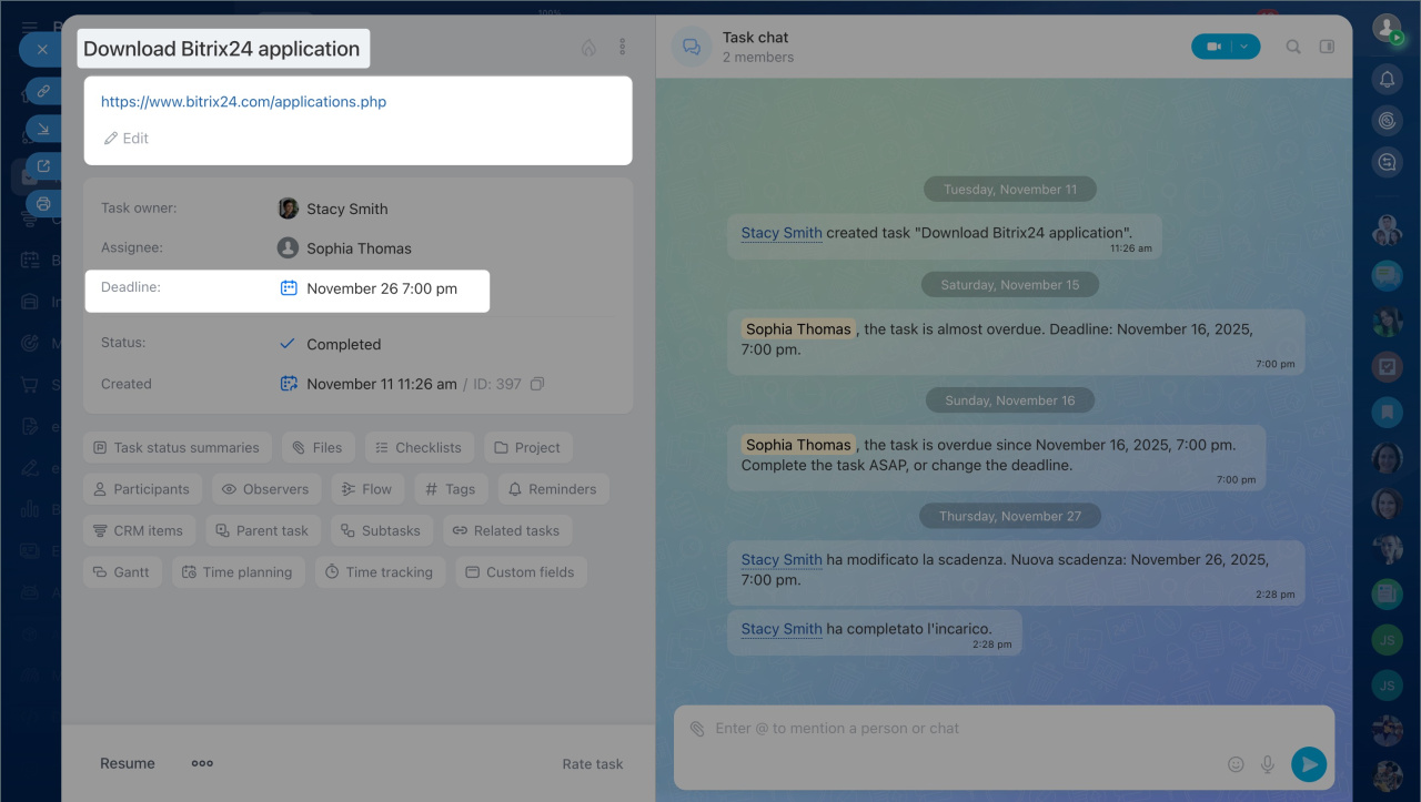 Tags in tasks and projects - Reminders — set reminders for the assignee, creator, or participants to ensure tasks are completed on time. For example, a manager can set a reminder three hours before the deadline to prepare a report.