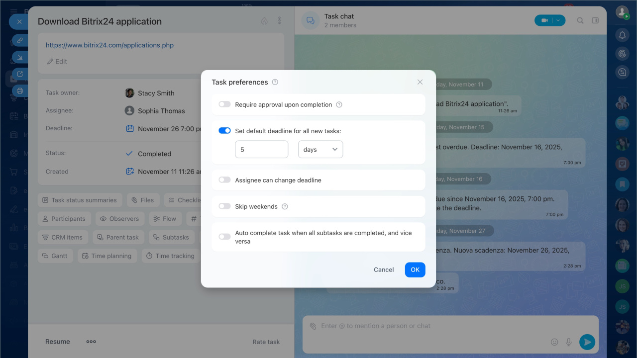 - Assignee can change deadline — the assignee can reschedule the task’s completion date. You can also configure a reason request for changes and limit the deadline changes by date or frequency.