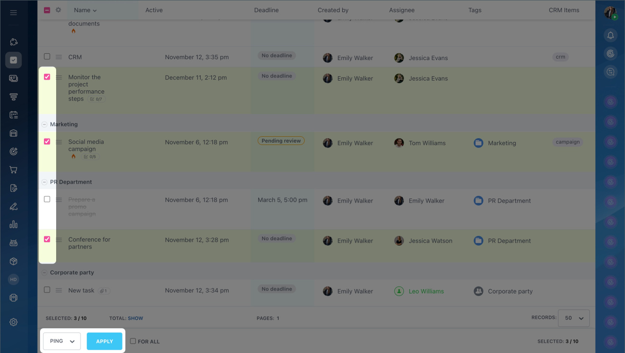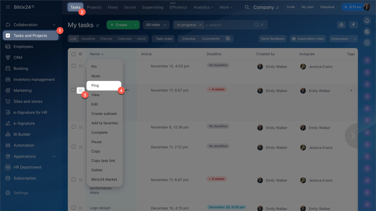 - You can send a ping from the task list: in the web version via the task menu, and in the mobile app by long-pressing the task.