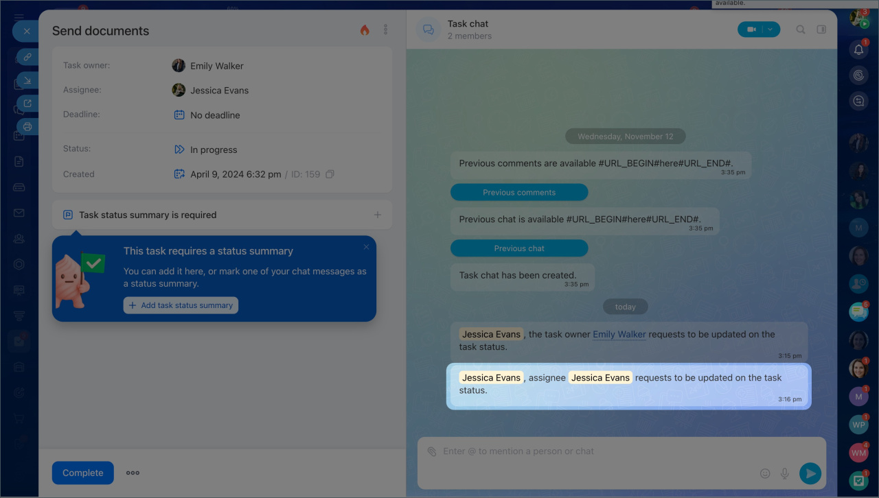 For example, the creator sends a ping to the designer, the task assignee. The designer receives a notification and responds in the task chat, allowing the creator to understand the current stage of work.