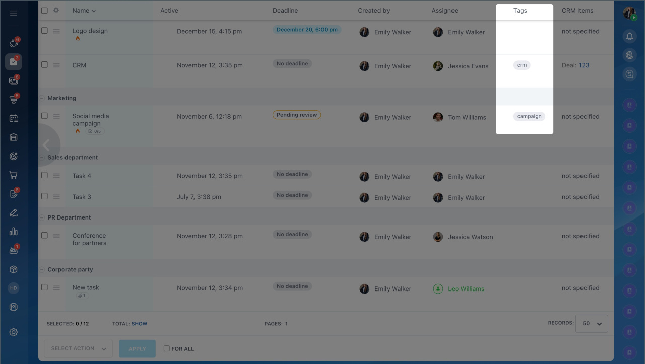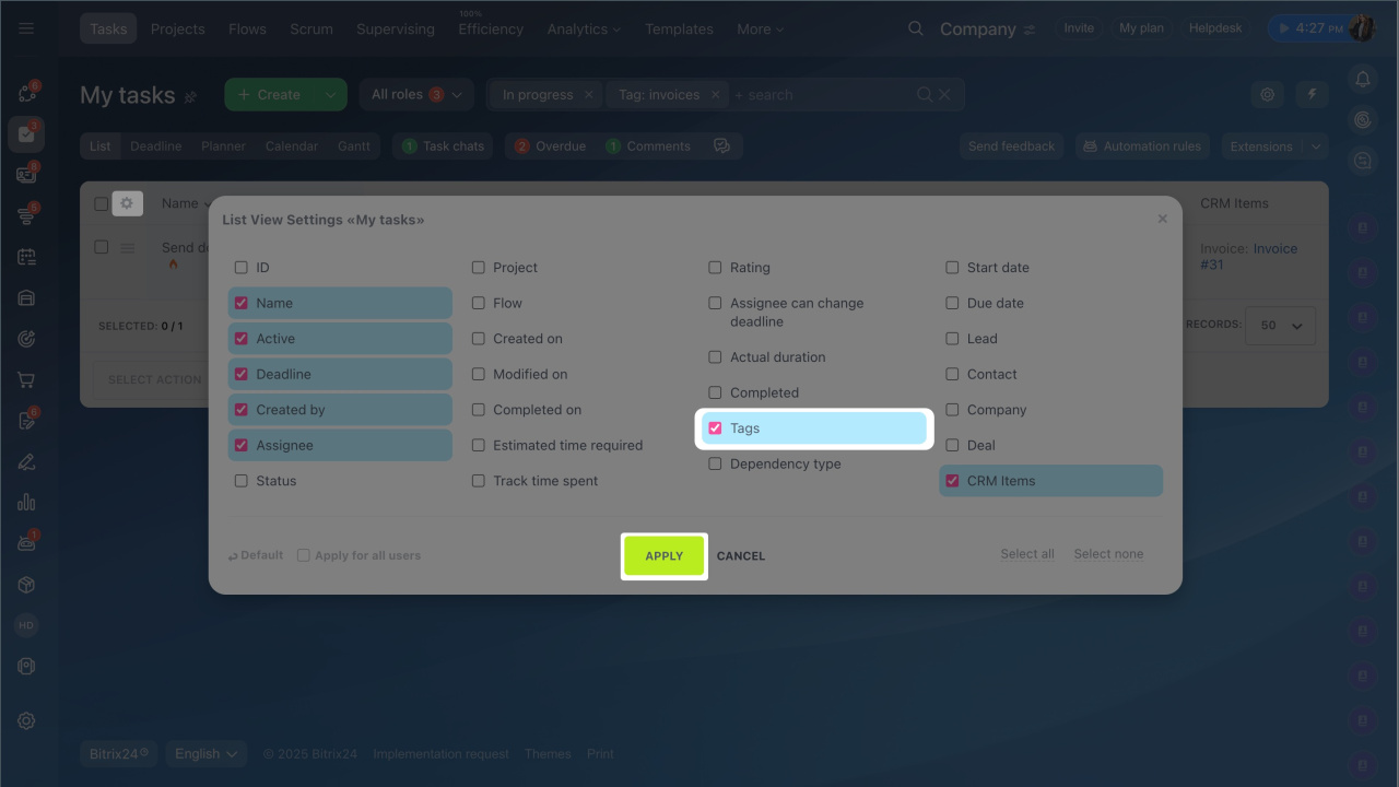 You can also search for tasks by tags in the task list. Add a tag field: open Settings (⚙️), check Tags, and click Apply. Then, click the tag name in the list — the filter will be applied automatically.