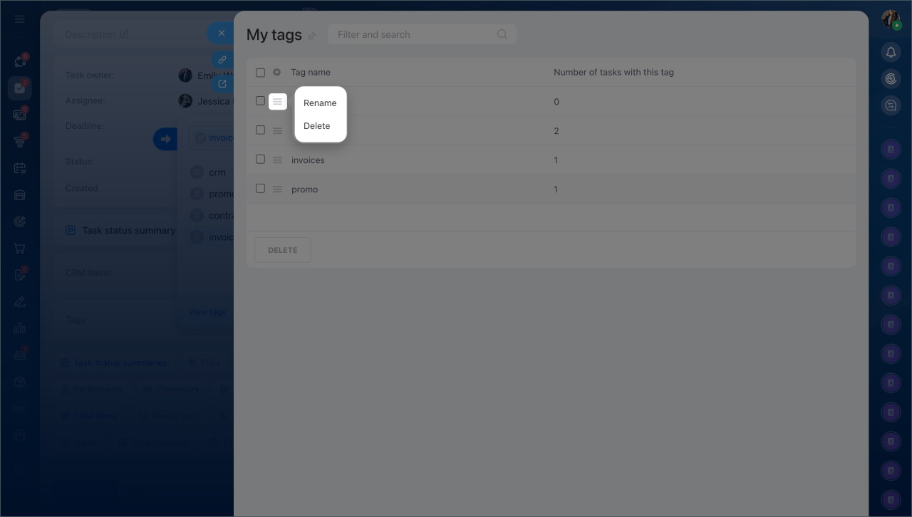 Editing and deleting tags is only available in the web version of Bitrix24. To rename or delete a tag, open the task, click ➕ in the tag block, and select View tags. Choose a tag from the list, click Menu (≡), and select Rename or Delete.
