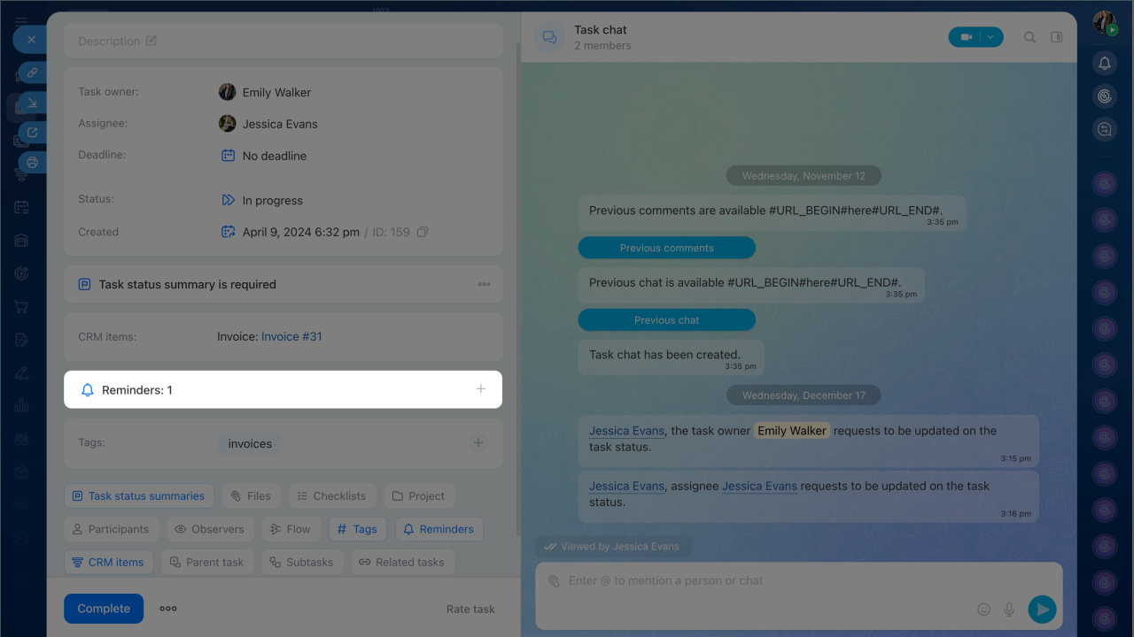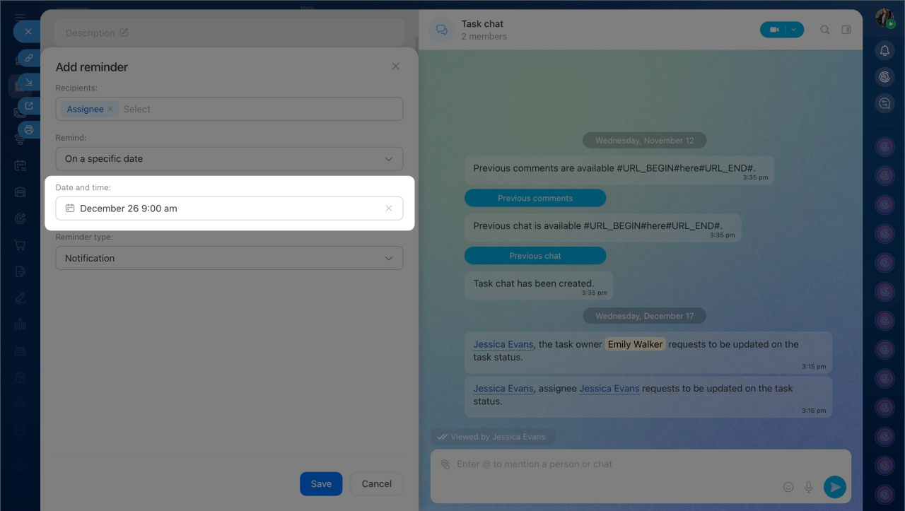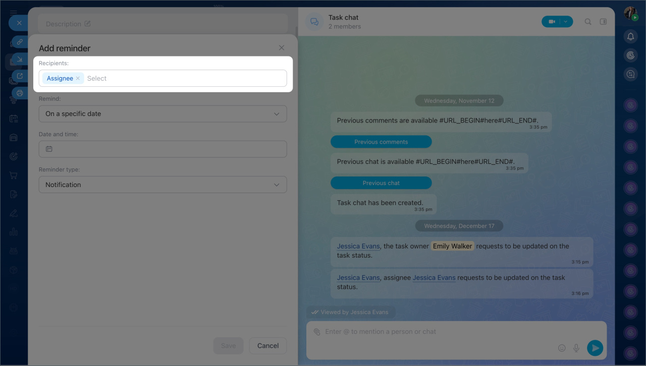 Any participant can add a reminder for themselves or colleagues — the assignee, creator, or participants. This can be done when creating or editing a task.