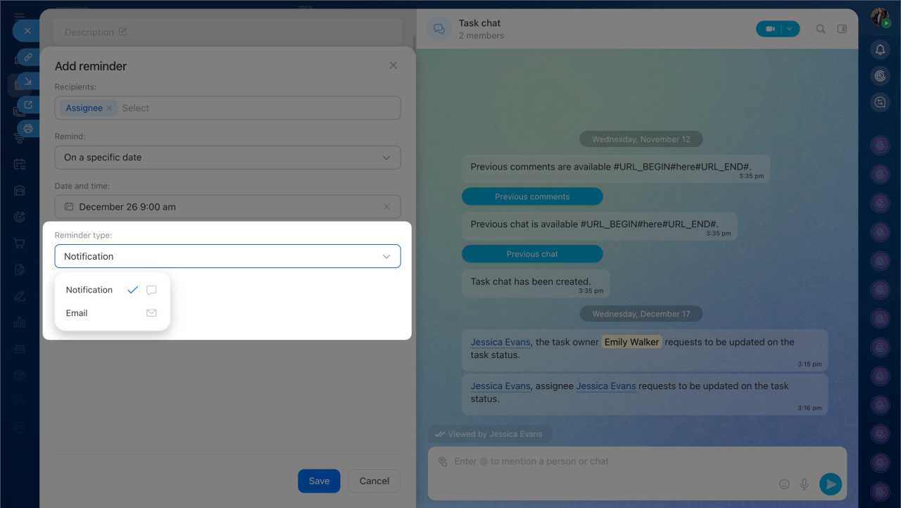 - Choose who will receive the reminder: the assignee, creator, participants, or yourself.