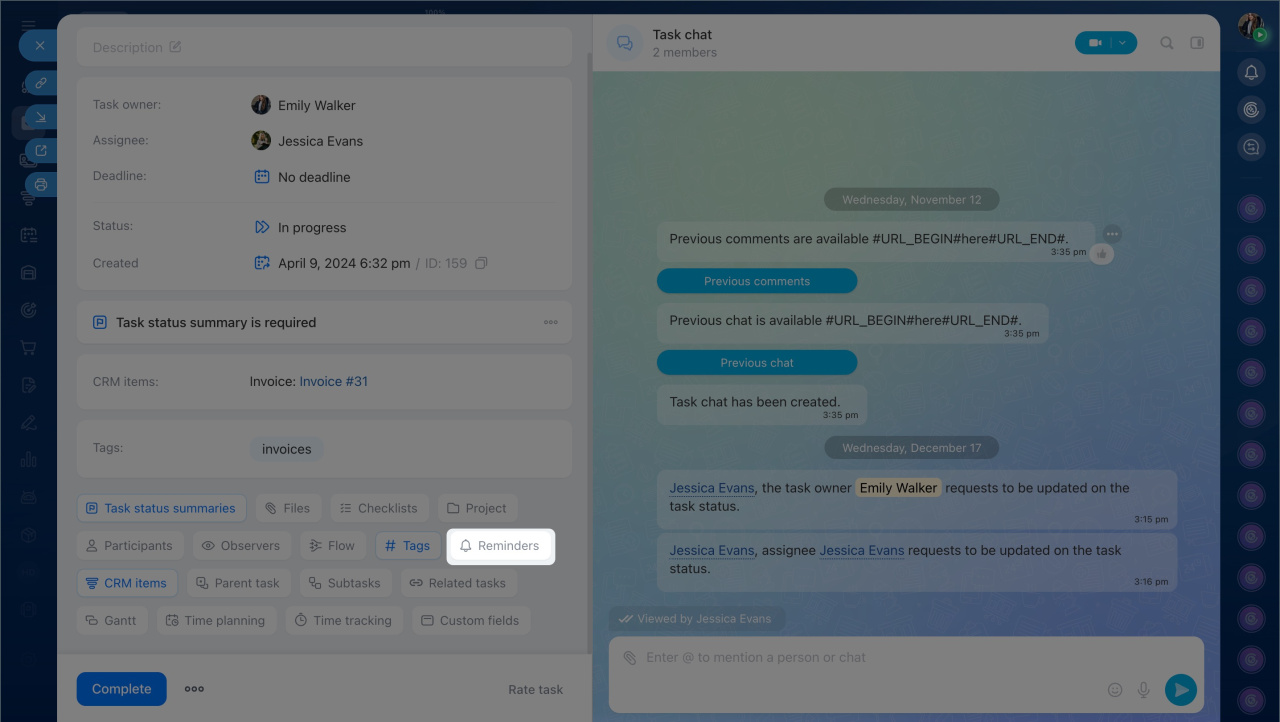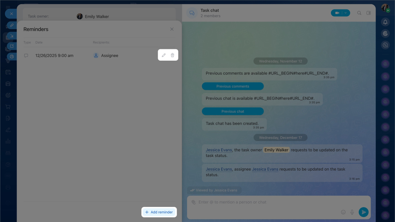 - All reminders set by an employee are saved in the task form. Click the Reminders block to expand the list, edit, delete, or add a new reminder.
