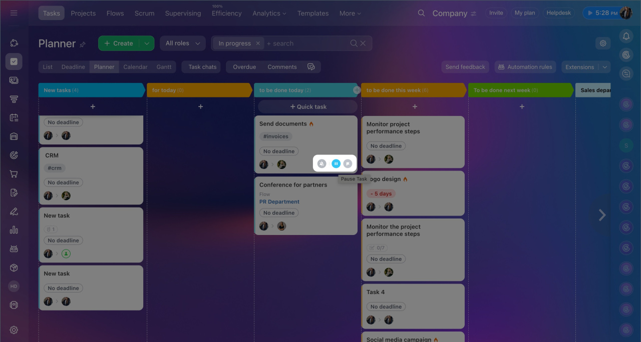 In Bitrix24, it's easy to track how much time is spent completing a task. Using the built-in timer, employees can log the periods they work on specific assignments. For example, they can start it in the morning and pause it during a meeting or a lunch break.