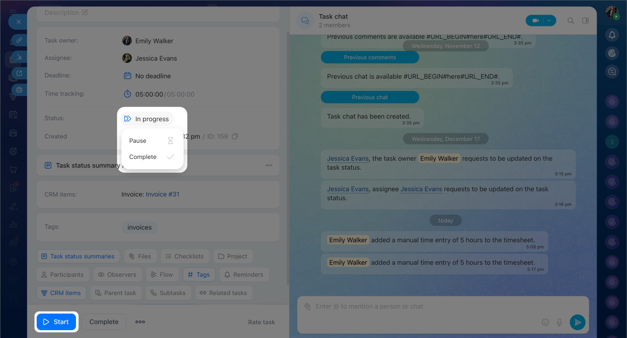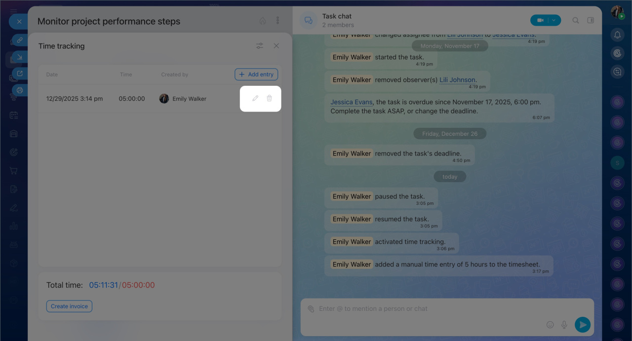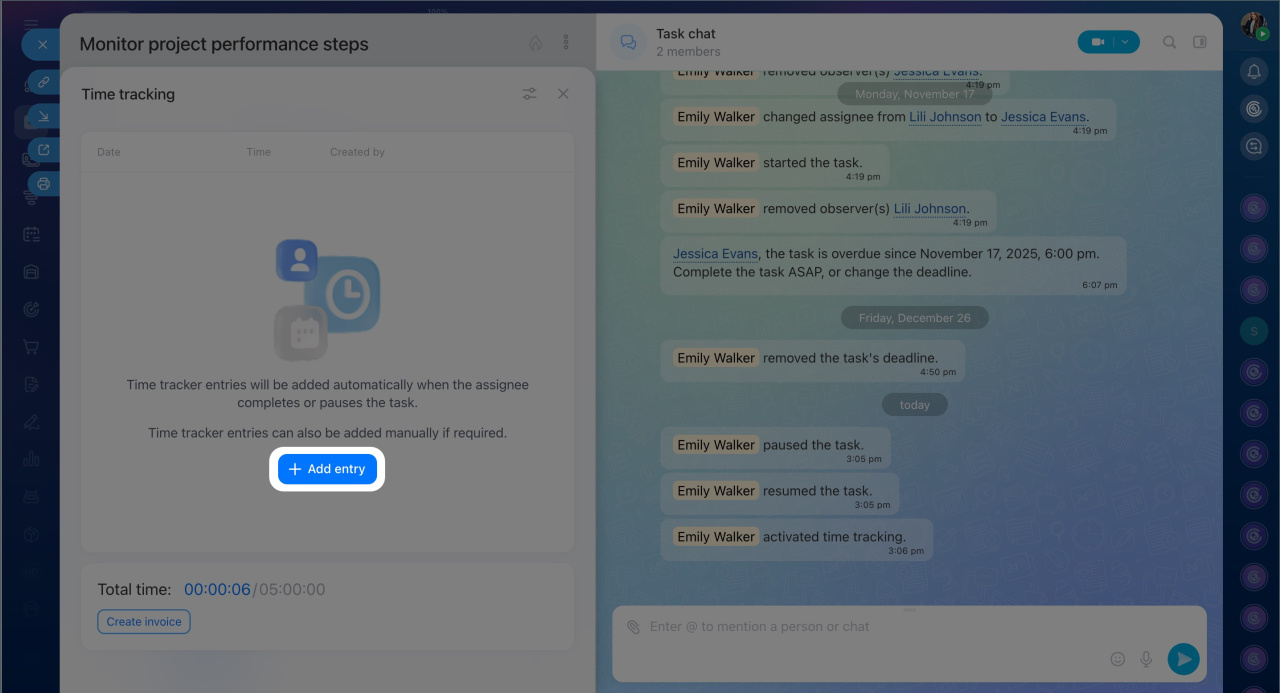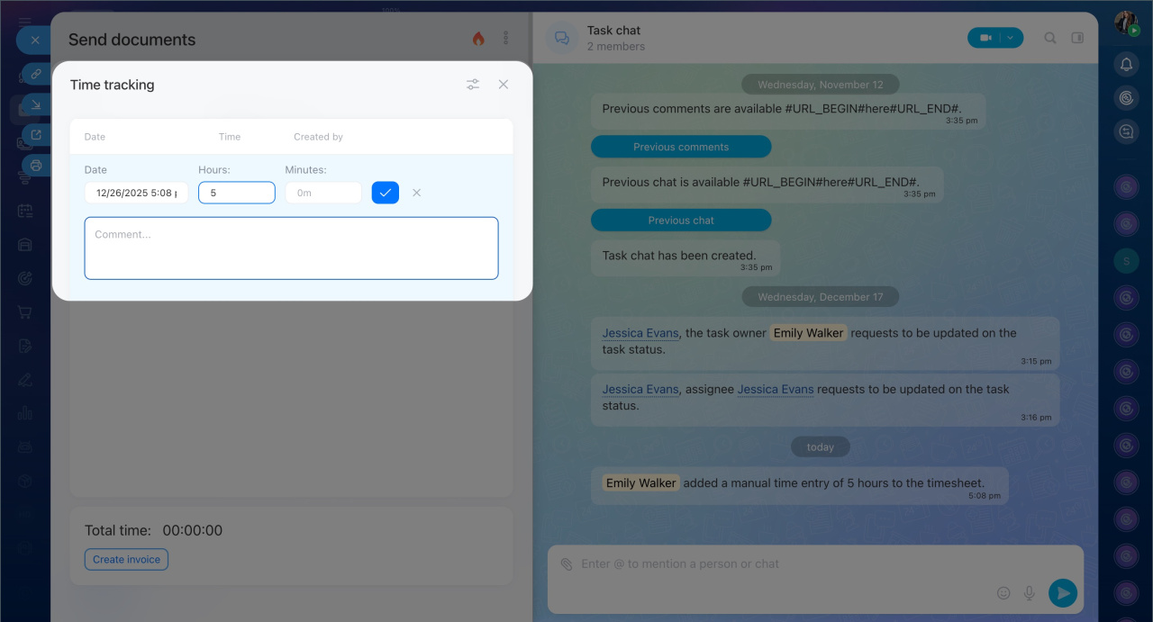 - The time tracking history shows who worked on the task, when, and for how long. You can view the history in the task chat or the task form.