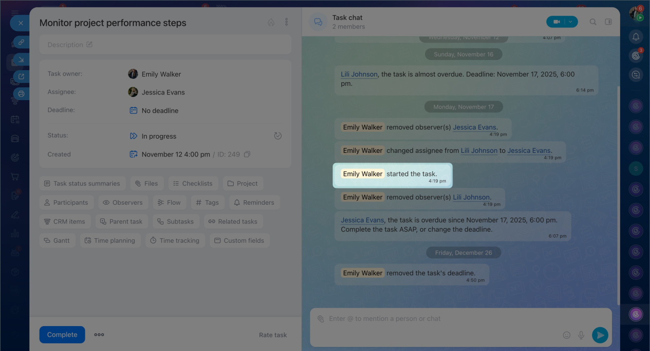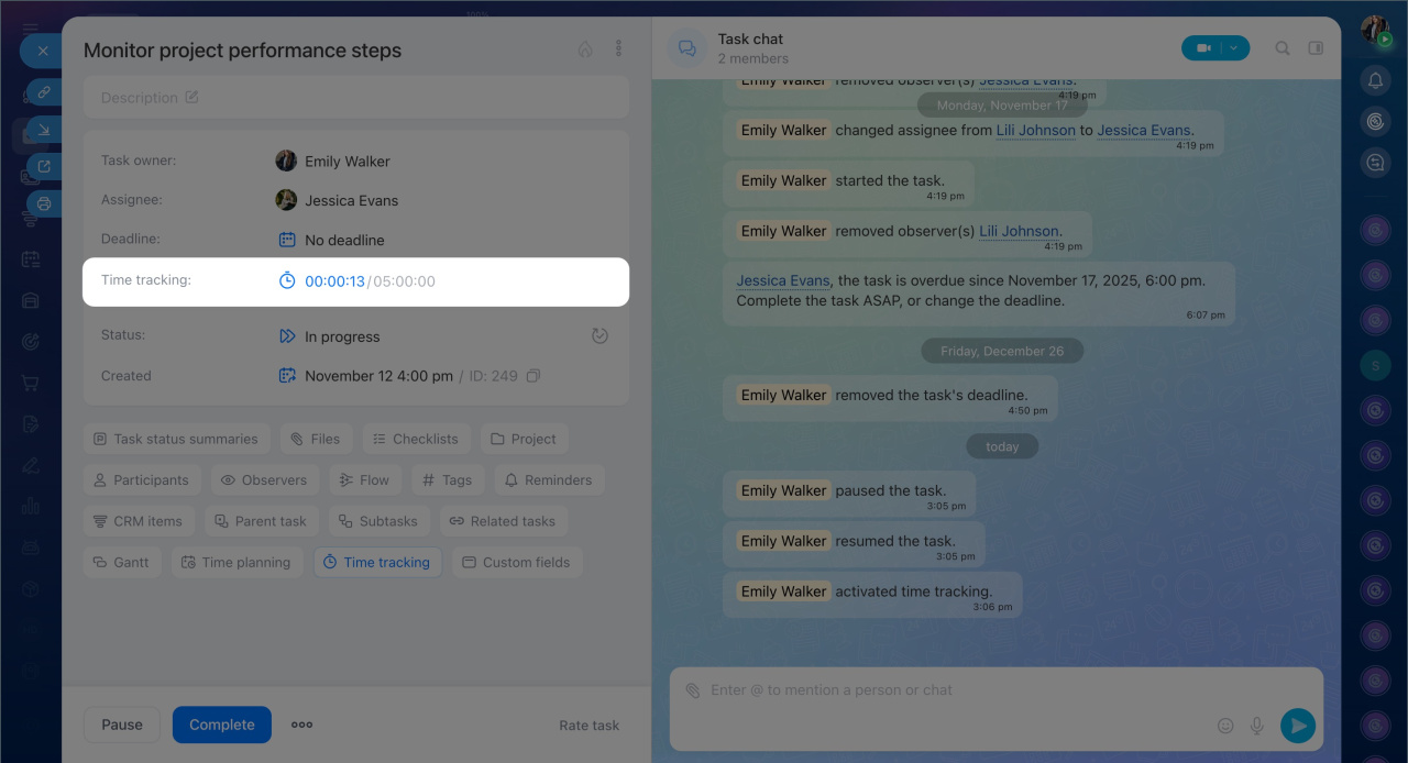 The time tracking history shows who worked on the task, when, and for how long. You can view the records in the task chat or the task form.