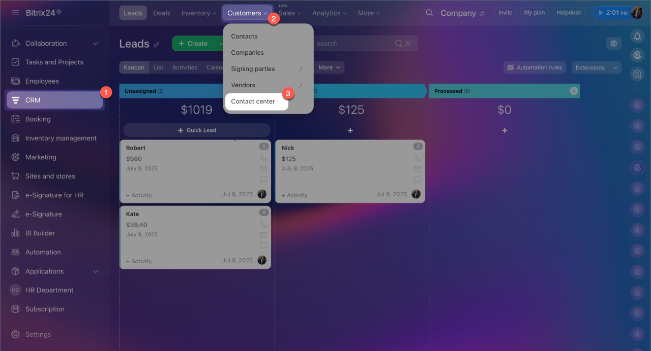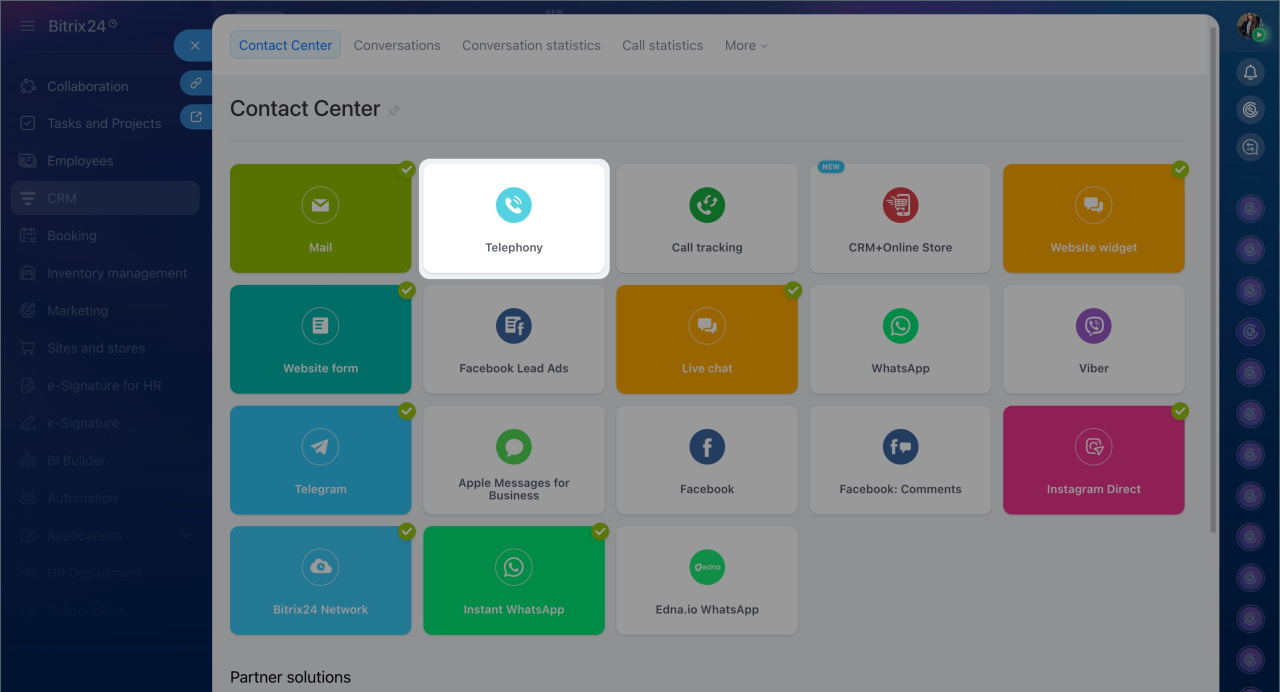 1. Go to CRM > Customers > Contact Center > Telephony > Connection.