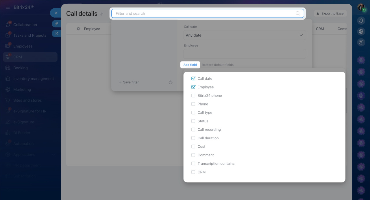 1. Click Filter and Search > Add fields and check the necessary fields.