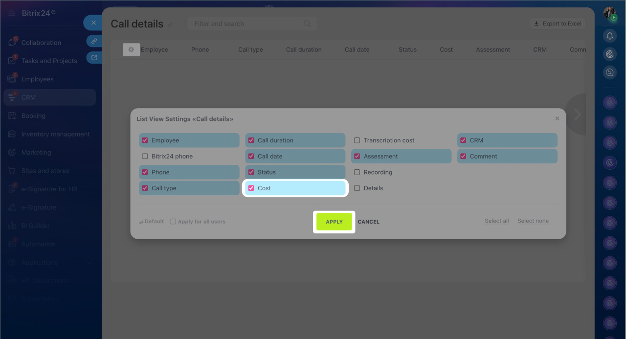 - To understand call expenses, open the Call details > Settings (⚙️) section. Add the Cost column and click Apply.
