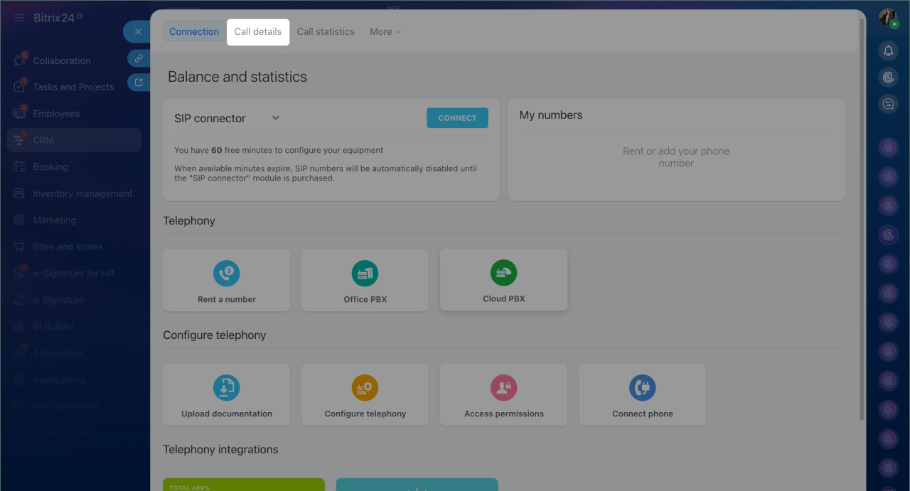 - You can check the telephony balance in the CRM > Customers > Contact Center > Telephony > Connection section. Click Top up to pay for telephony.