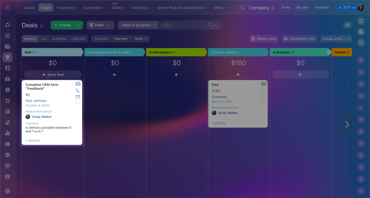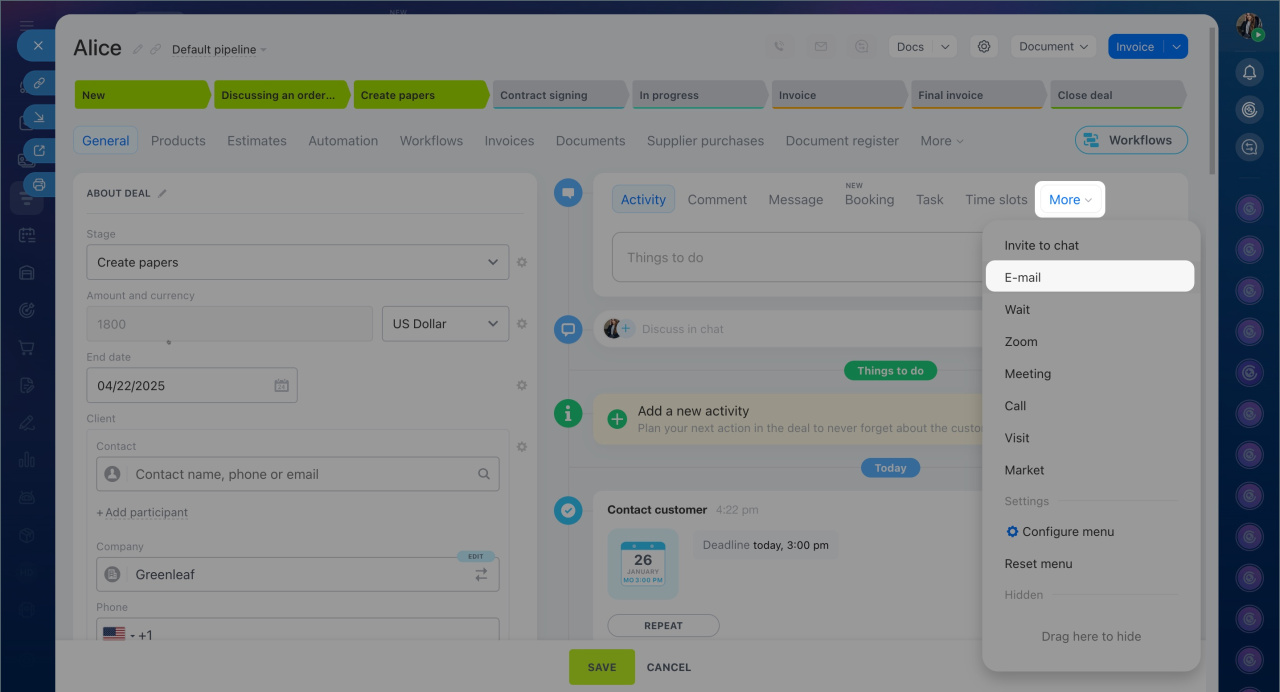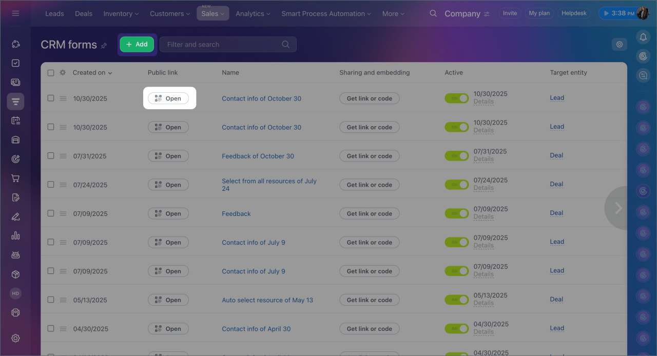 1. Go to CRM > Deals and open any form.