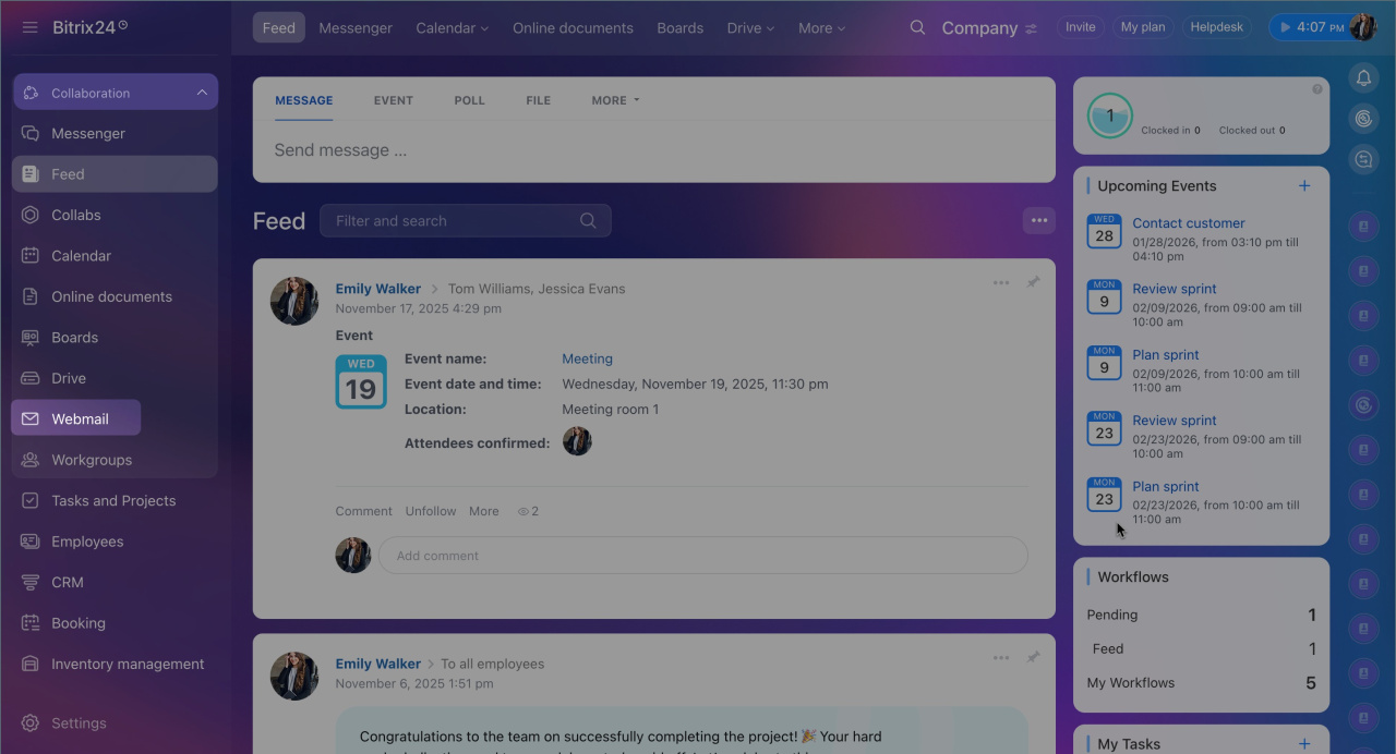 Mailbox added in the Webmail section is suitable for receiving and sending emails. Any employee can connect it unless restricted by the Bitrix24 administrator.