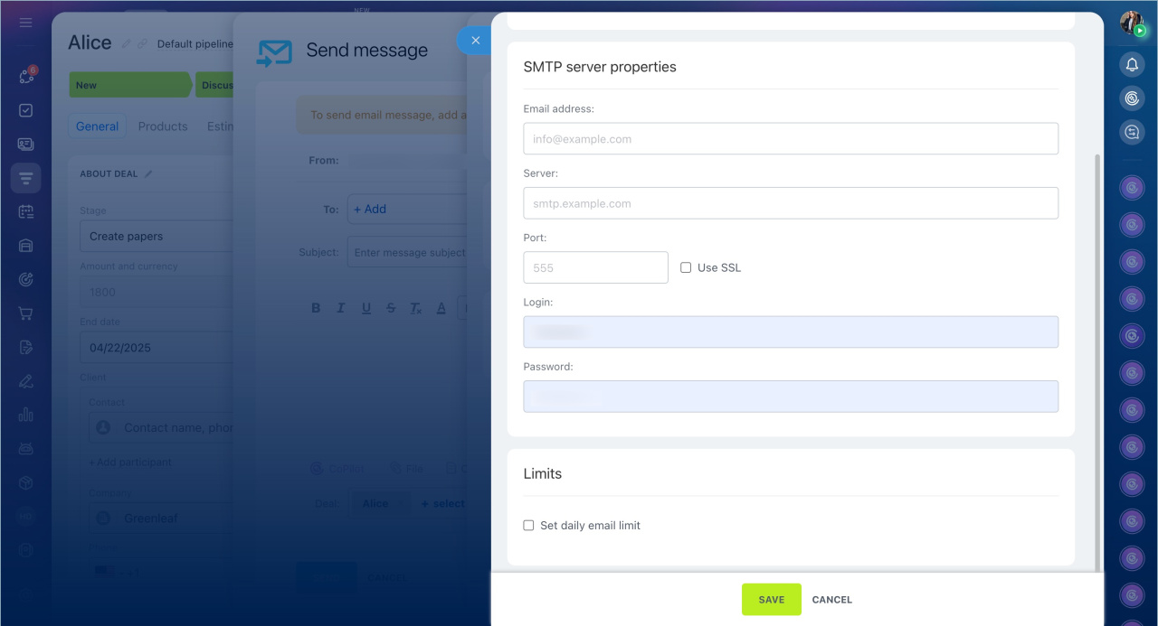 - To duplicate form data to email, connect a mailbox in Bitrix24 or configure an SMTP server.