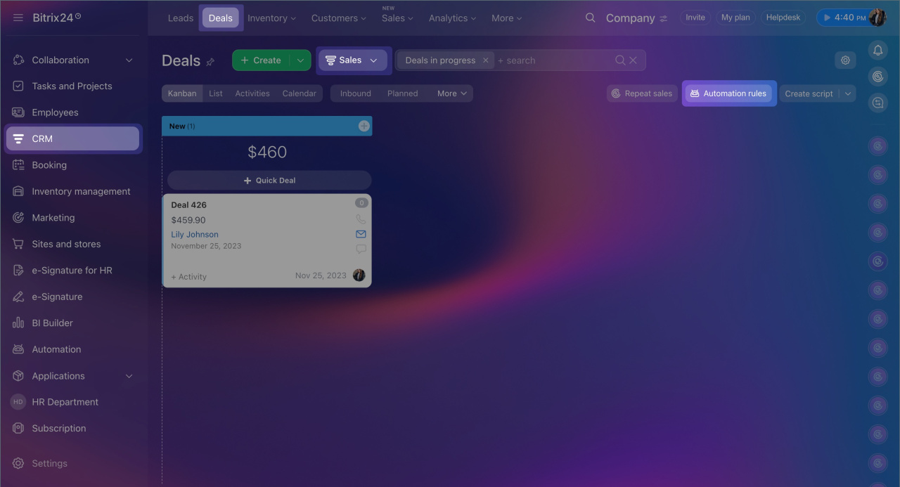 To automatically send CRM form data to an employee's email, use automation rules. These need to be created and configured for the items that appear in the CRM after a client fills out the form. For example, if you need to duplicate data from all forms that create deals, set up the automation rule in deals.