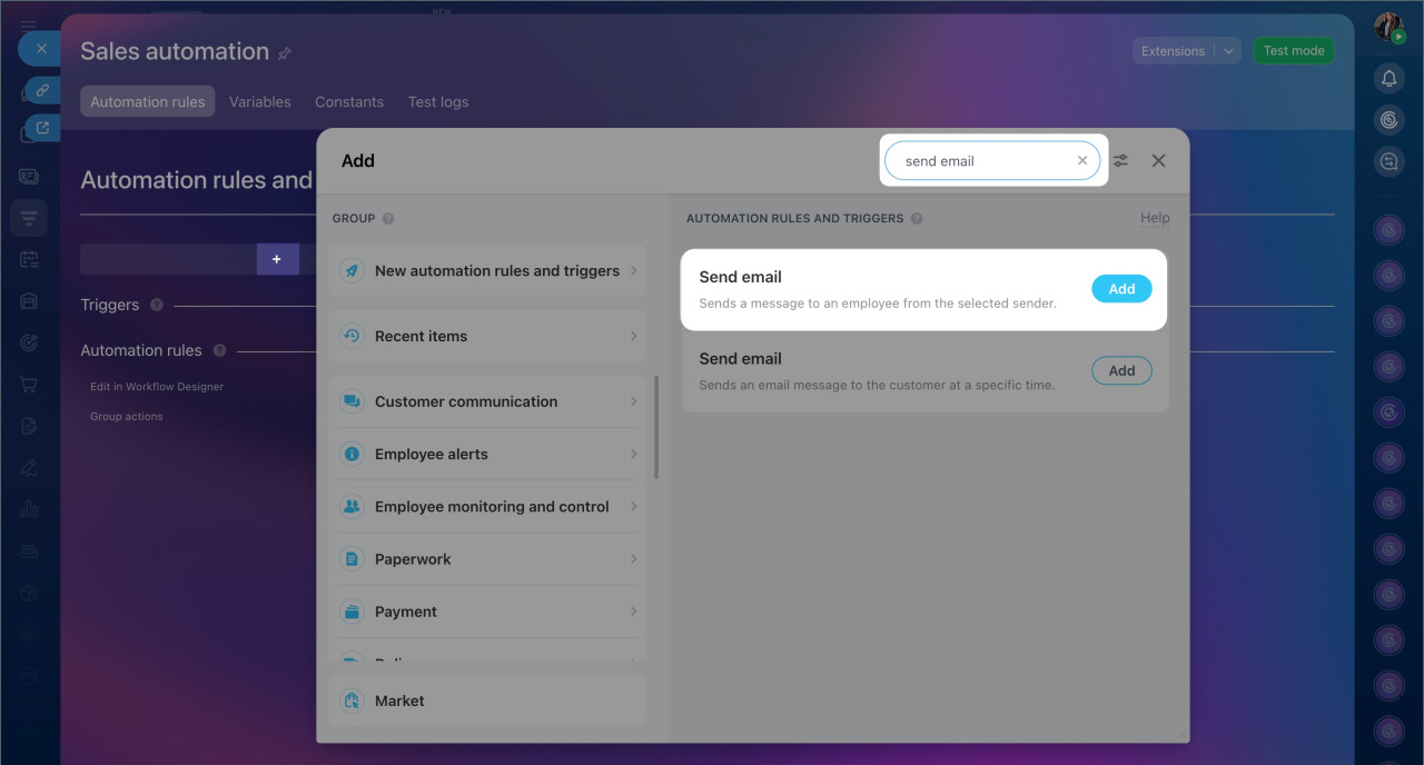 5. In the search bar, type Send email to employee. Add the automation rule — a configuration window will open.