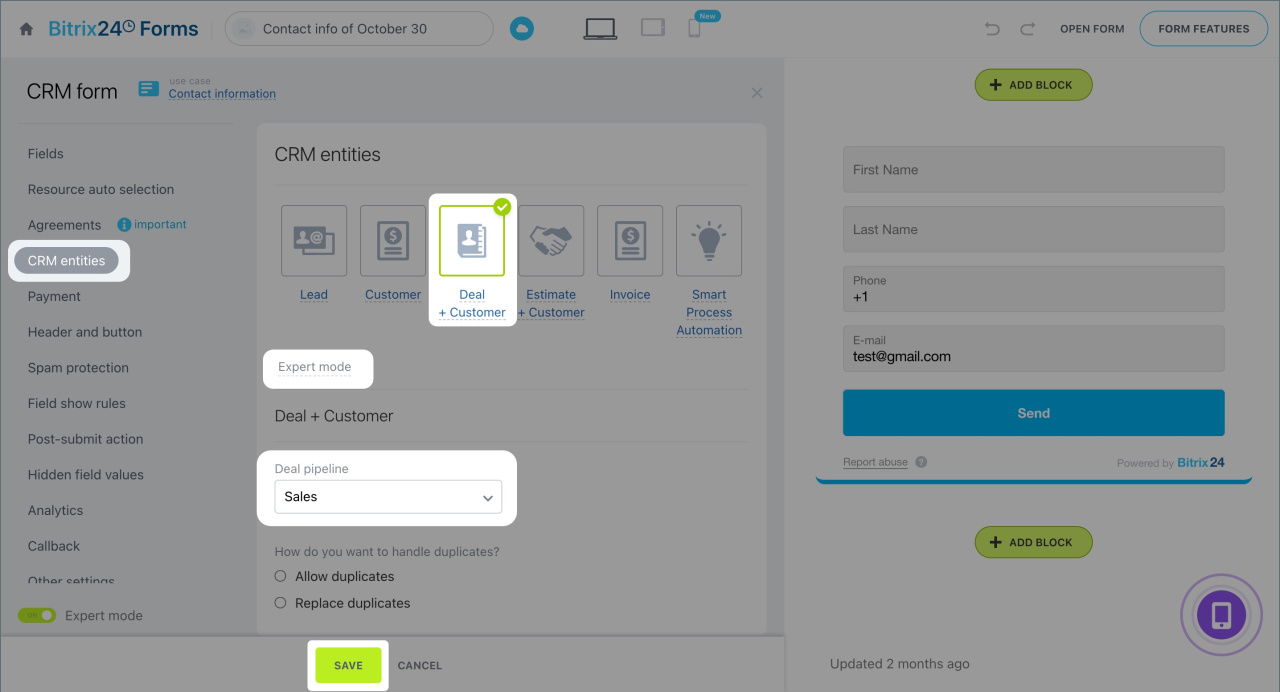 4. If the form creates a deal or smart process, click Advanced settings and select the pipeline where the forms will appear.