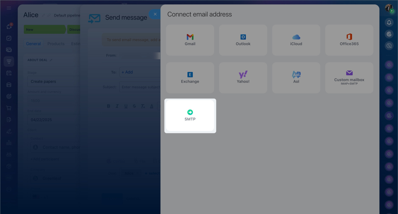 Set up sender option. Connect a mailbox for outgoing emails via an SMTP server. It will not appear in the Webmail section and will only be available in the sender list. This option is available in the Webmail, CRM, and Marketing sections.