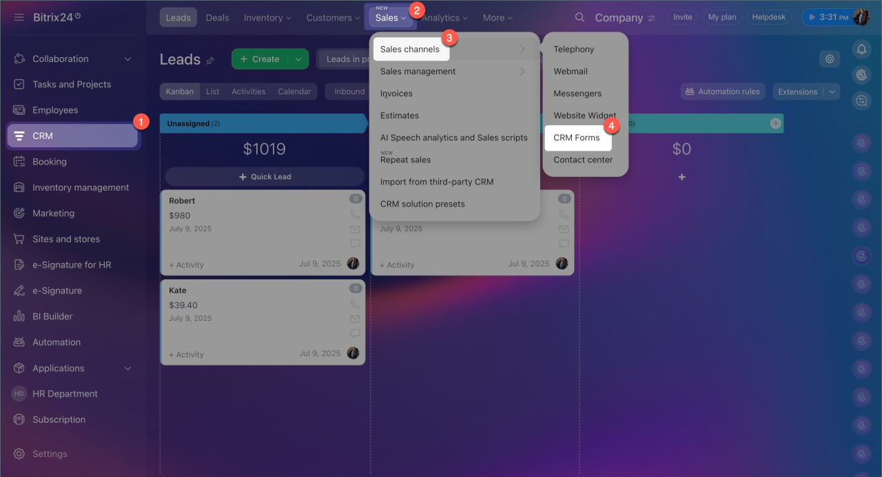 1. Go to CRM > Sales > Sales Channels > CRM Forms.