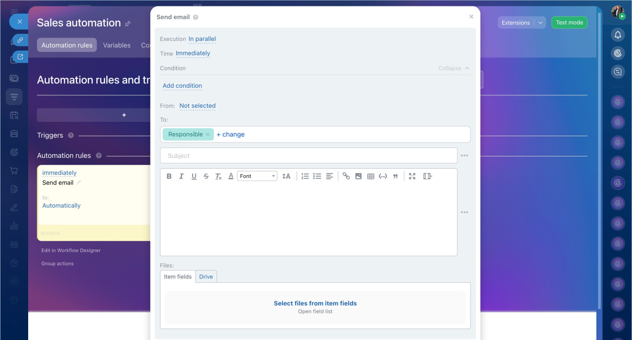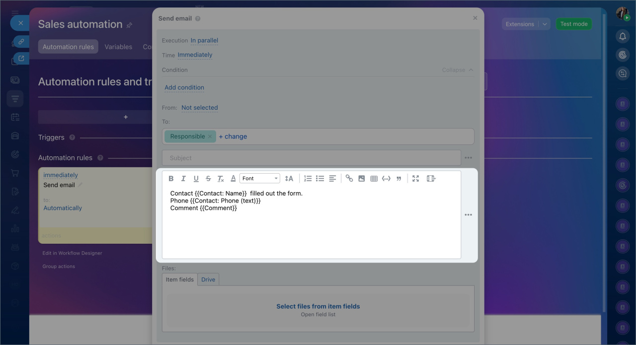- Configure the automation rule: specify its parameters and add field values from the CRM form to the email subject and body. Use fields from the same items as in the CRM form.