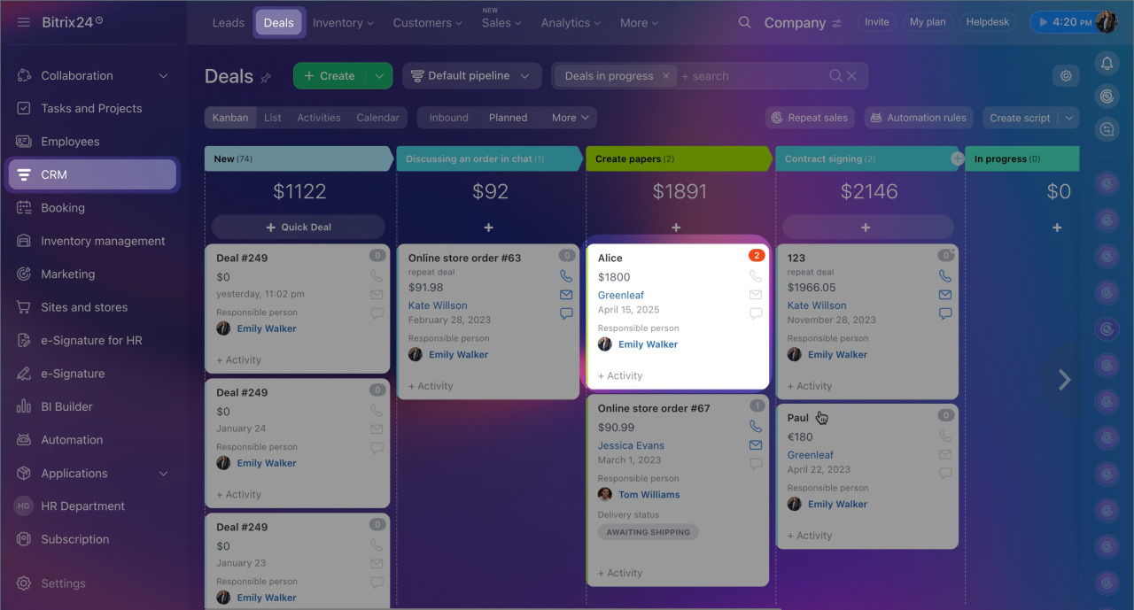 1. Go to the CRM section and select the required item, such as Deals.