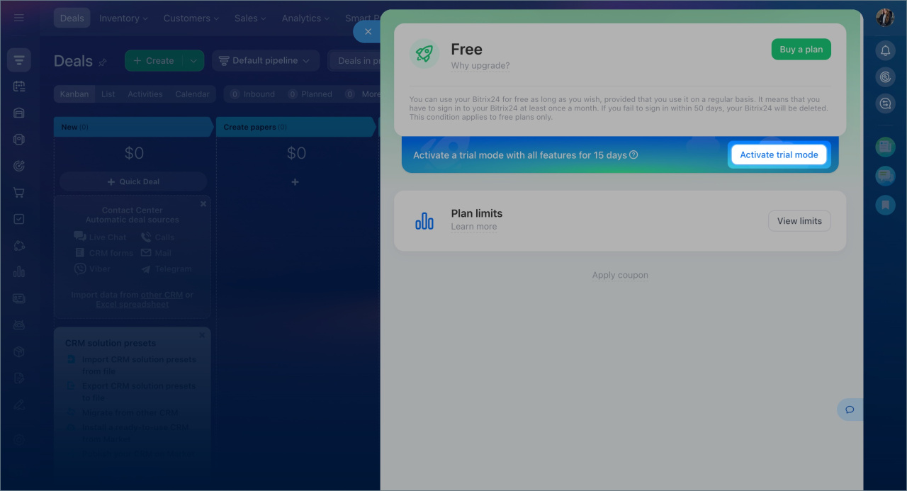 Trial mode. Activate a 15-day access to the Professional plan features and explore Bitrix24 tools before purchasing a plan.