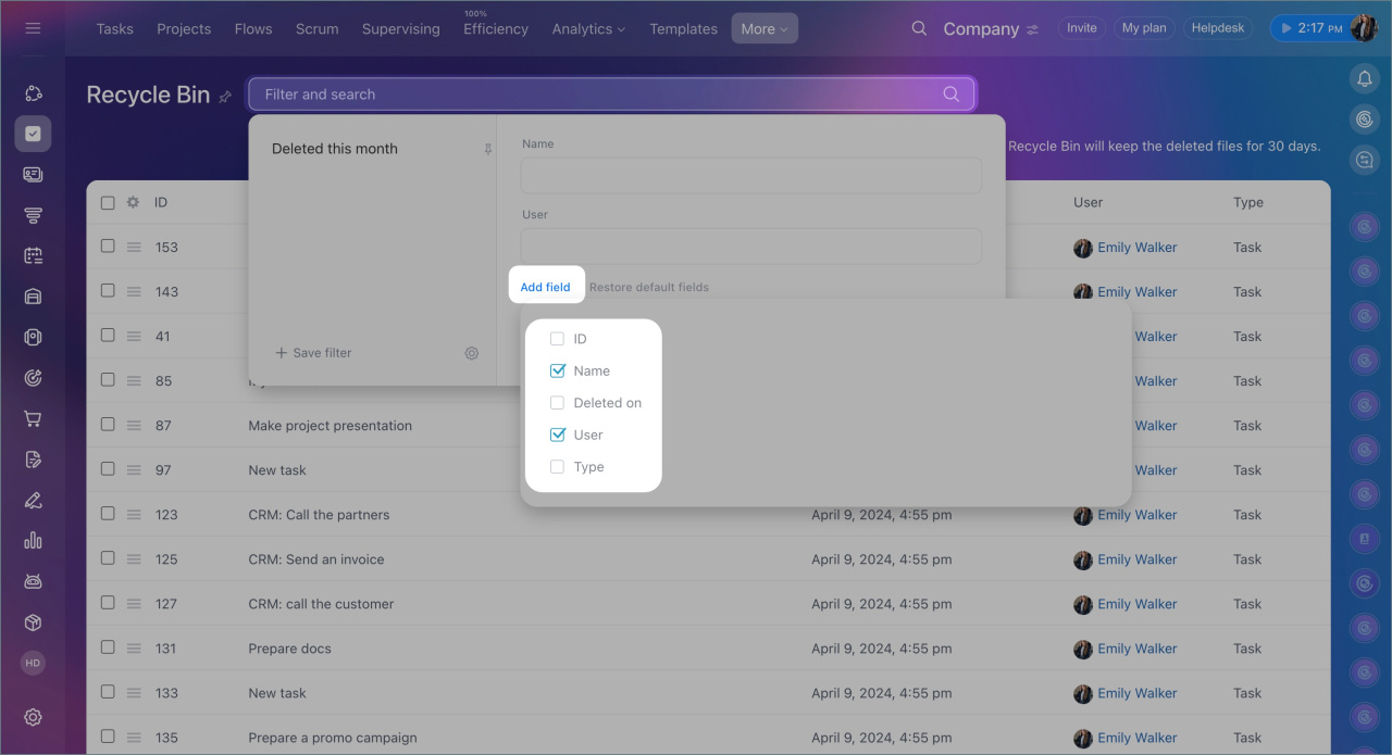 3. If you are a Bitrix24 administrator, you can find deleted tasks of a specific employee using the filter: add the User field and select the desired person.