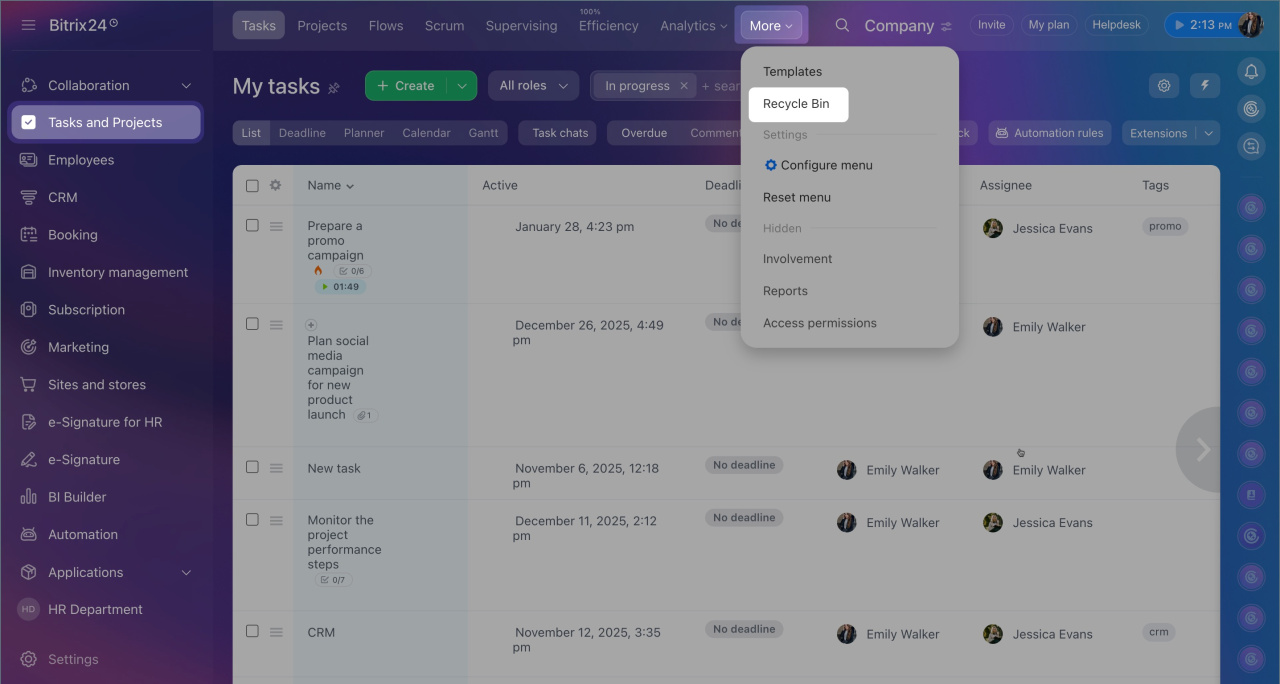 - In Bitrix24, deleted tasks are first moved to the recycle bin.