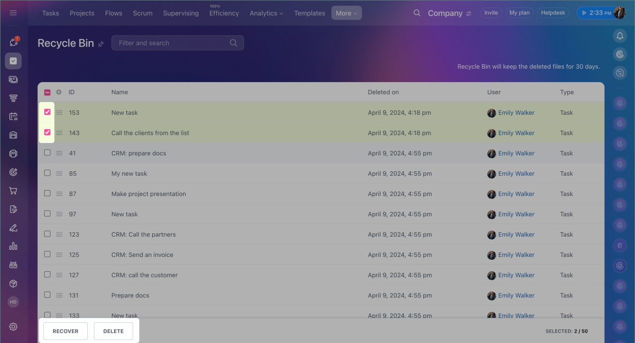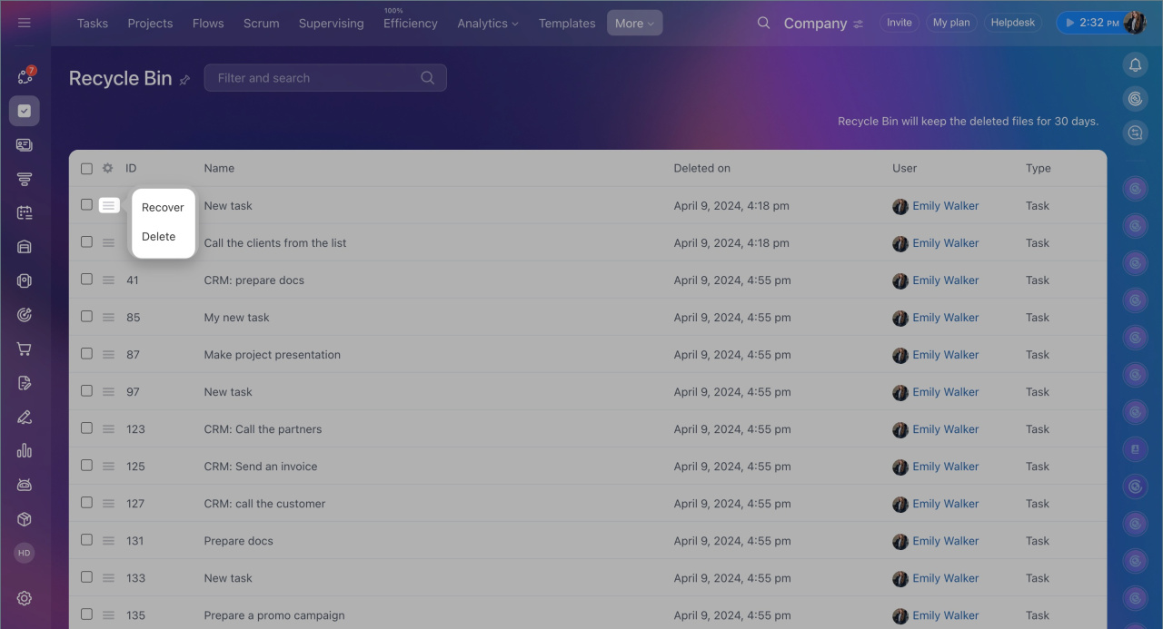 In Bitrix24, deleted tasks are first moved to the recycle bin, where they are stored for 30 days. If a task was deleted by mistake and contains important discussions or files. You can recover it along with the chat history. If the task is no longer needed, it can be permanently deleted from the recycle bin. After 30 days, tasks are automatically removed.