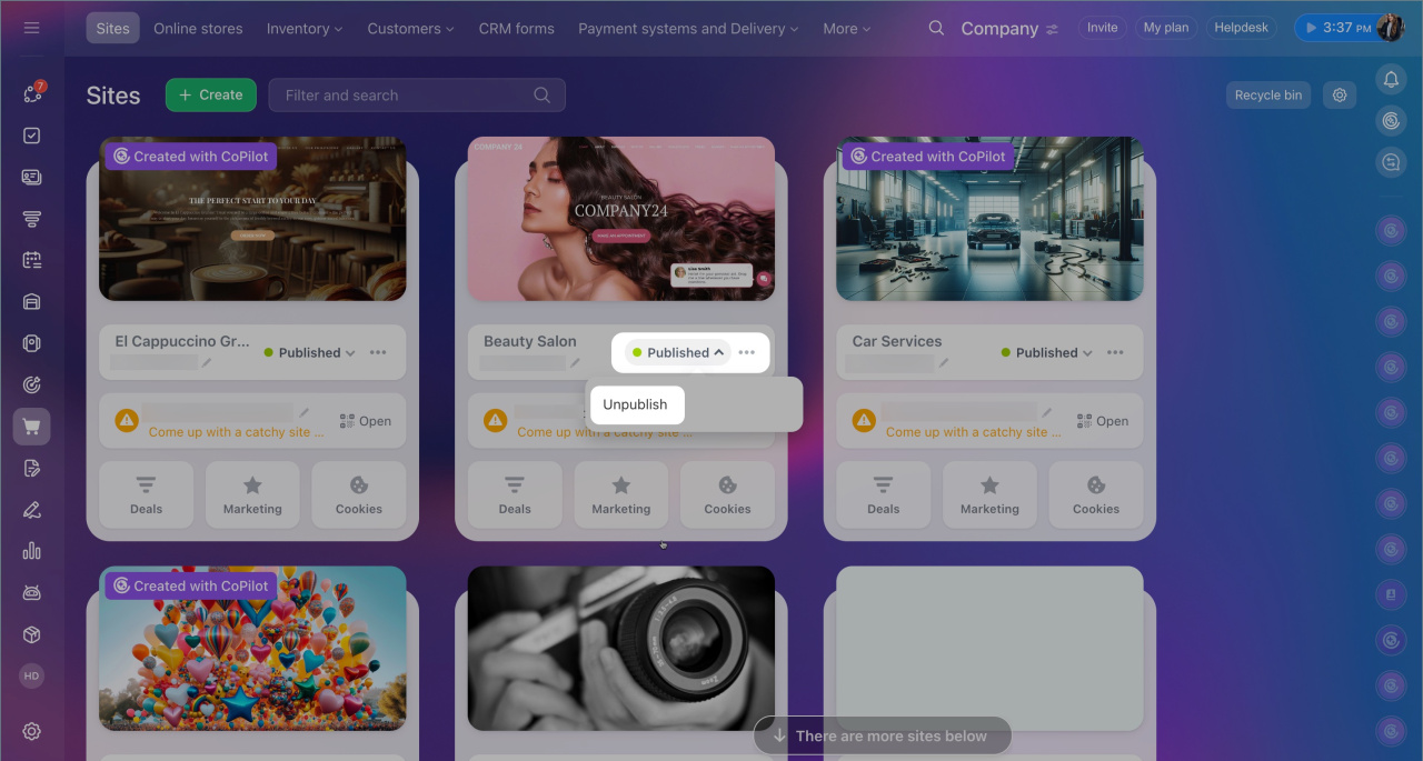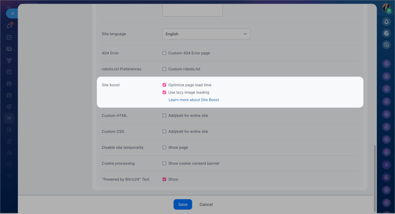 - To speed up your site, go to Sites and Stores > Sites, select the desired site, and click Three dots (...) > Site settings > More. In the Site boost section, enable the Optimize page load time and Use lazy image loading options. Save the changes.