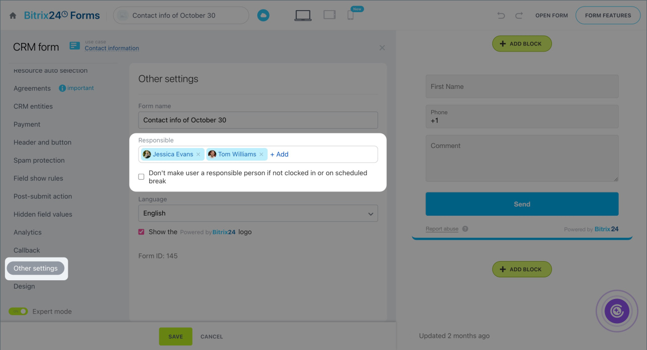 - Responsible — select employees from the list. Items created in CRM after form submission will be distributed among responsible employees in order.